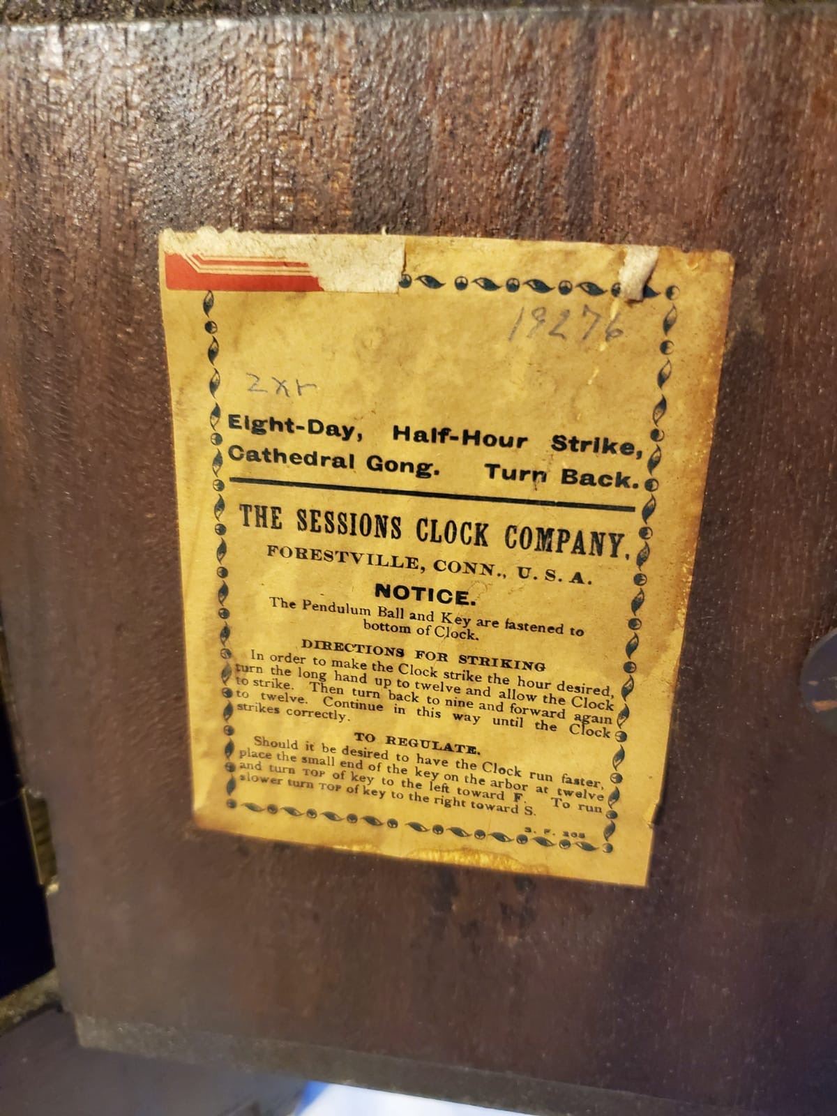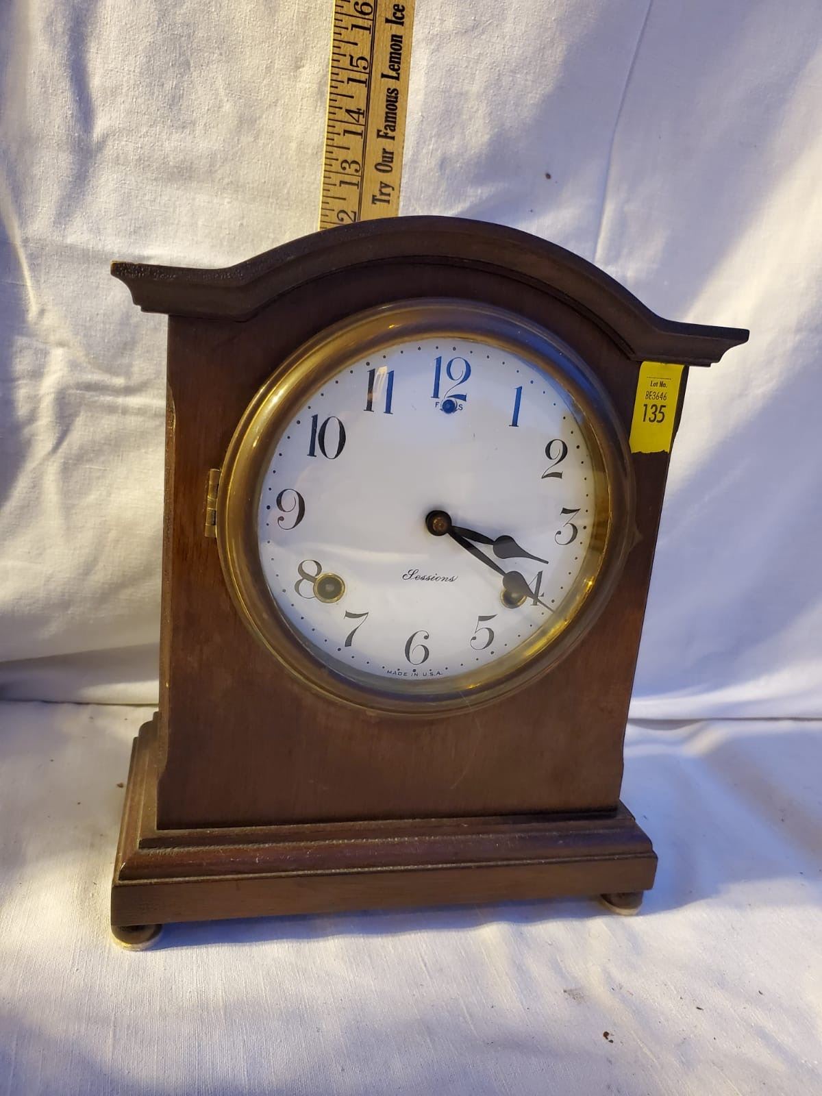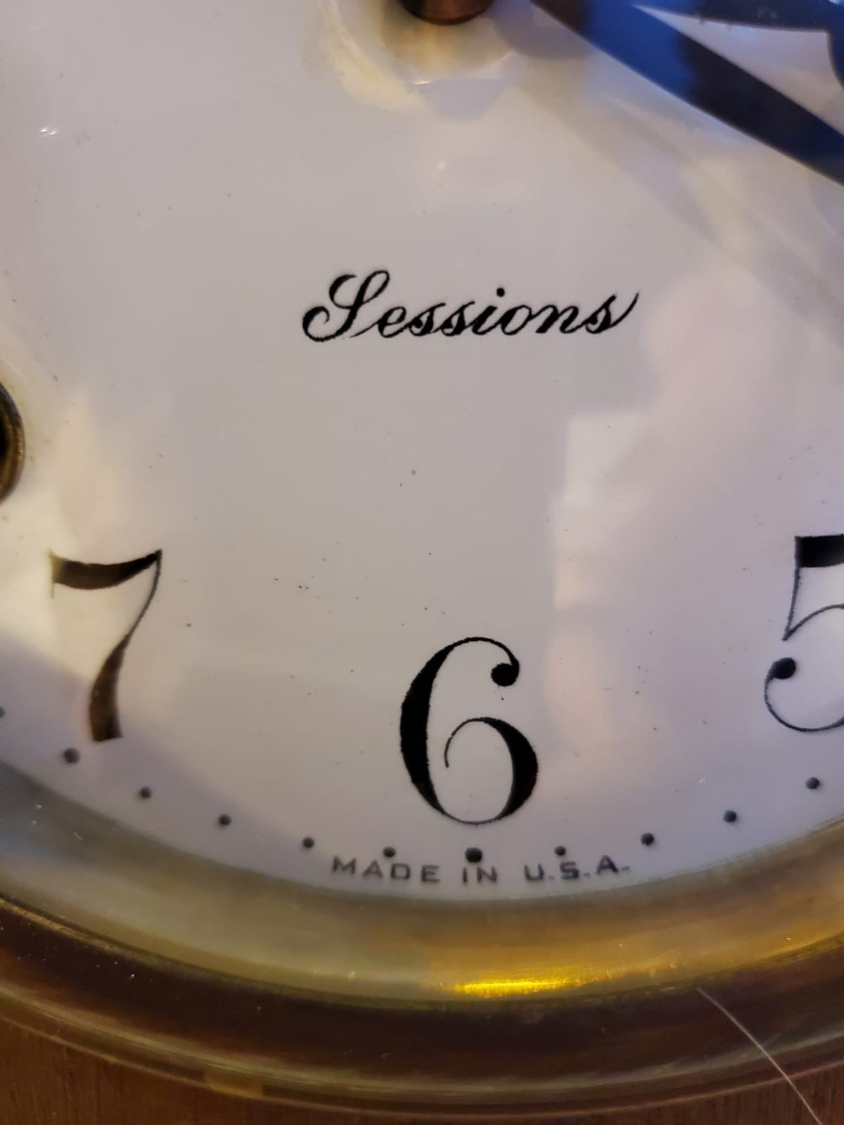 Vintage Sessions mantel clock. with original label on the back. Measures approx. 12 Inches tall.