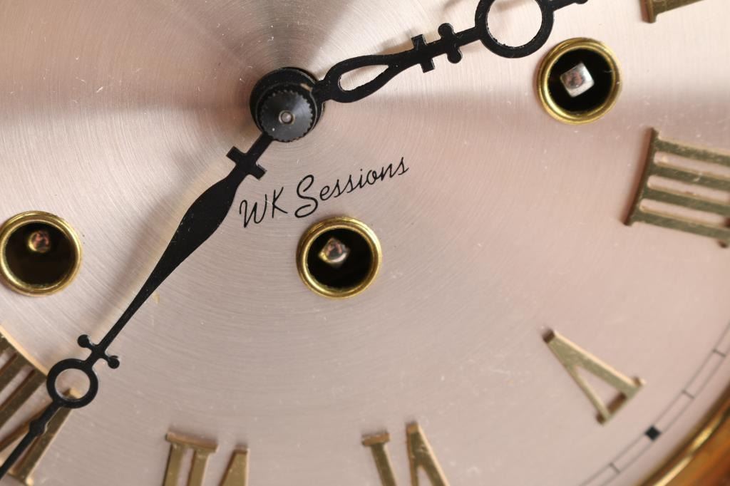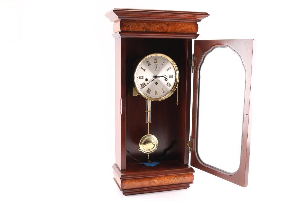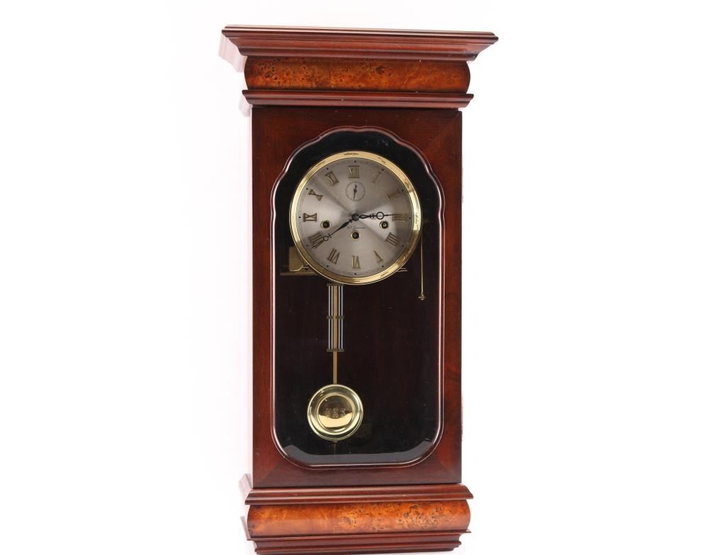 With two tone mahogany and burled wood case. In running condition. 28" x 12". With West Minister chimes. Local Pickup Only.