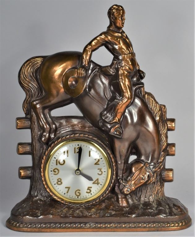 Sessions Western Americana Decorative Clock. Let 'er Buck image. Ca. 1950's. Copper flashed white metal. Not working, very good overall condition. 11 1/2 X 13 1/2 X 3 inches.