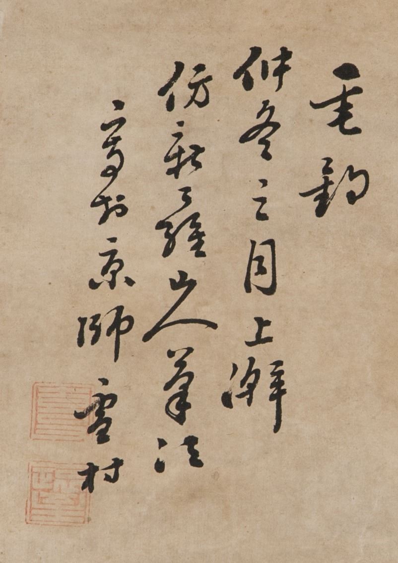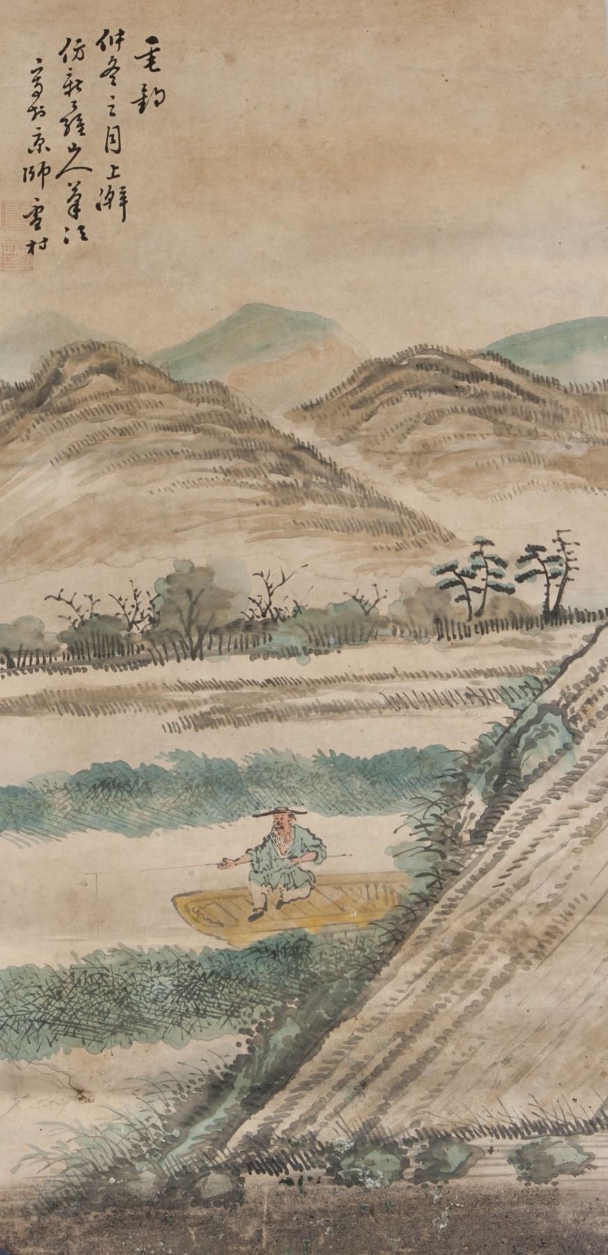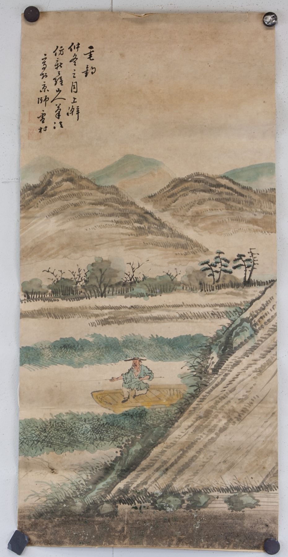 Ink on paper. Featuring mountainous landscape and fishing man. Signed Sesson Shukei 1504-1589 Japanese, inscribed with 2 artist seals. 64 x 31 cm. PROVENANCE: Collection from American collector since 1945 in Japan and China; found in basement after his passing.