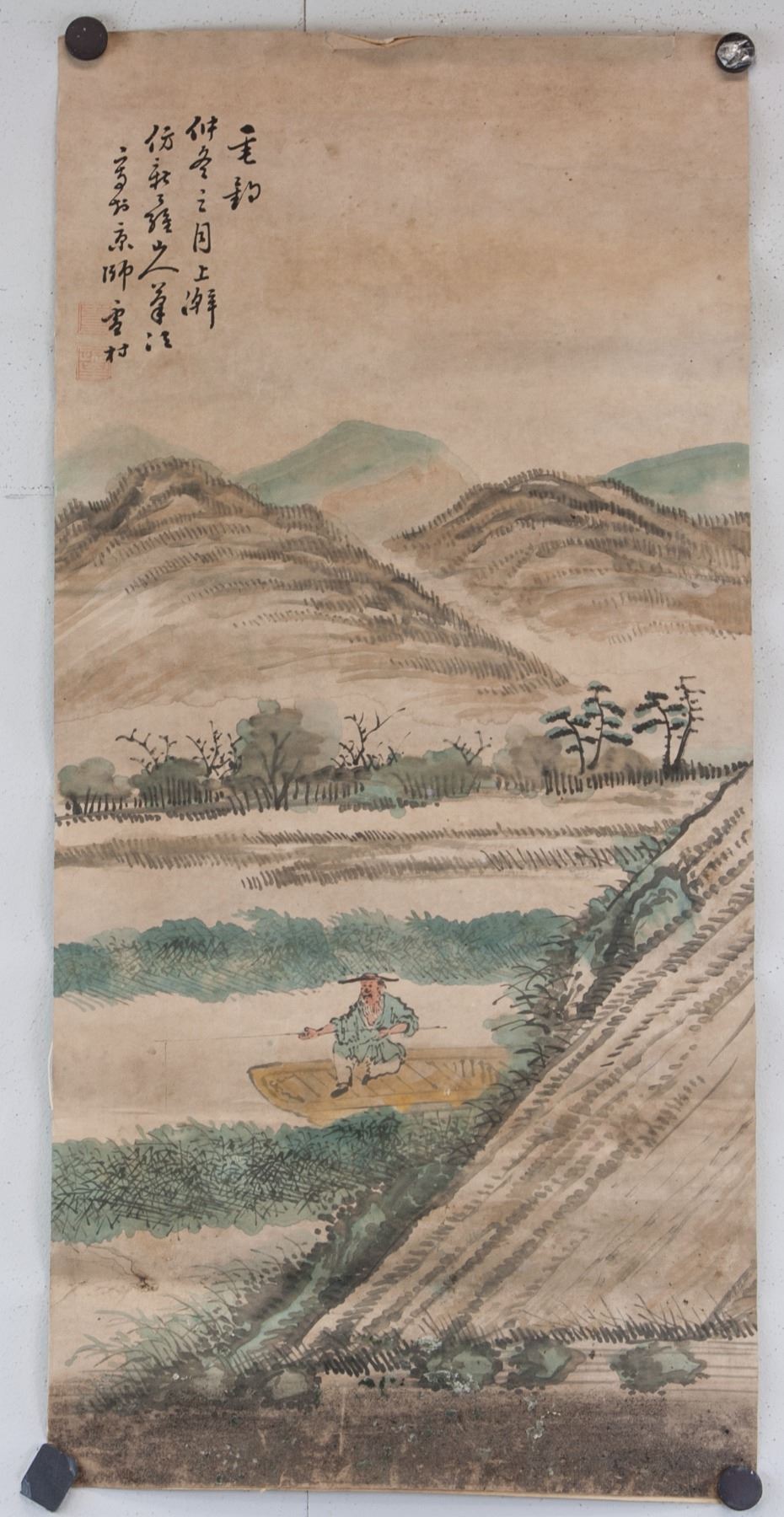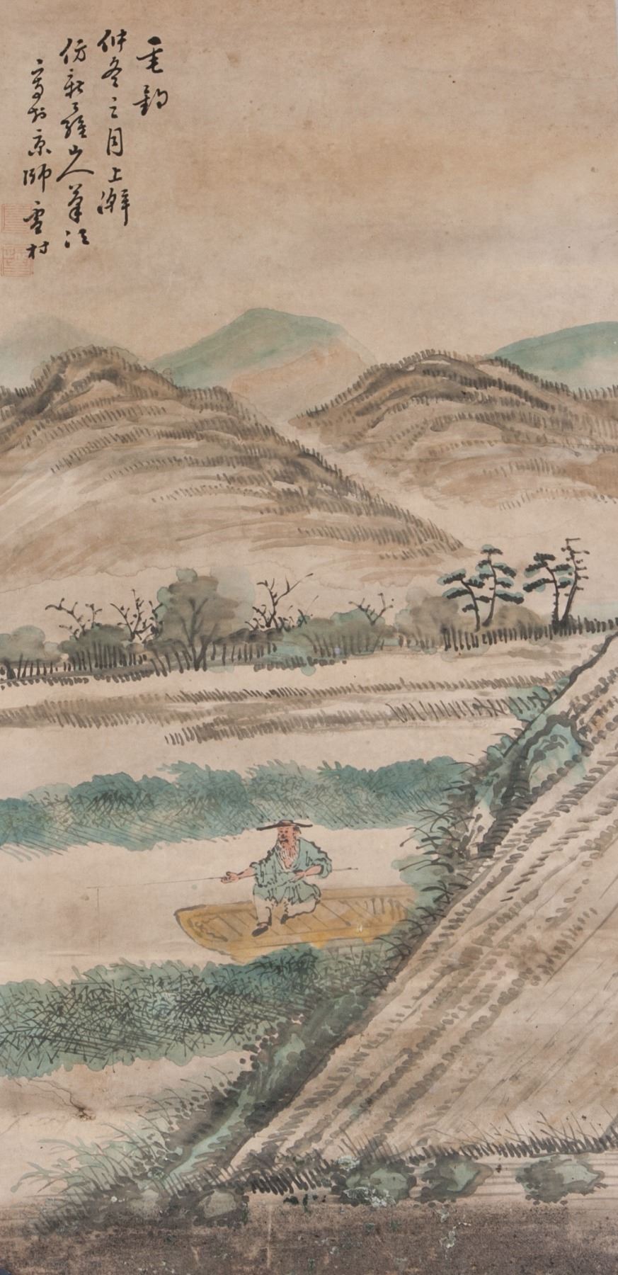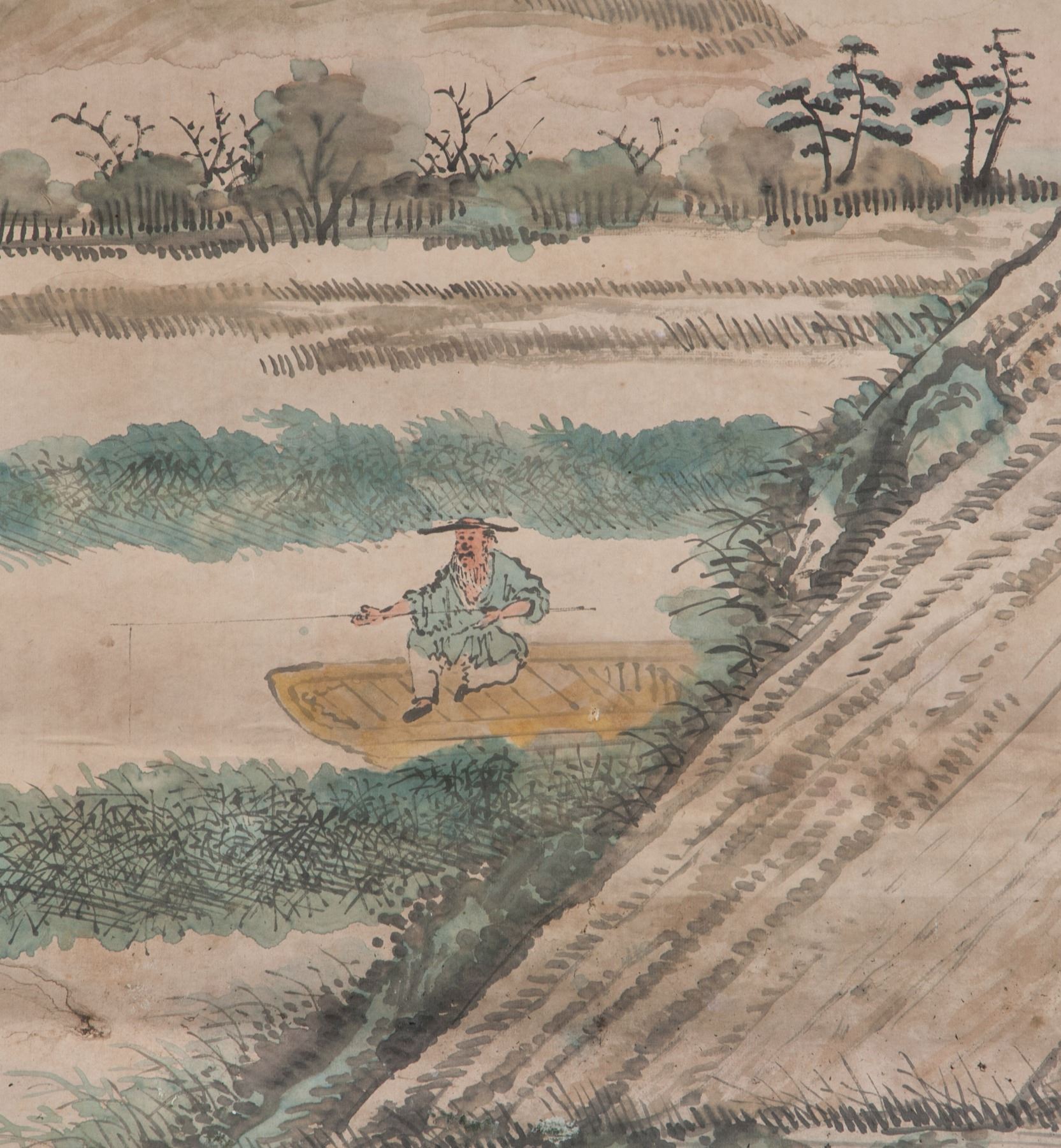Mountainous landscape and fishing man; Japanese ink on paper; signed Sesson Shukei (1504-1589); inscribed with 2 artist seals; 64 cm x 31 cm