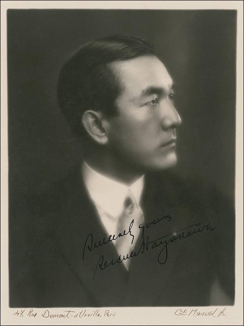 Distinguished Japanese actor (1889–1973) best known for his Oscar-nominated portrayal of a prison-camp commander in the film Bridge on the River Kwai. Handsome vintage matte-finish 6.75 x 9 photo of Hayakawa from early in his career, signed in fountain pen. Lower border bears photographer’s name and Paris address. In fine condition, with a bit of scattered light silvering to background.