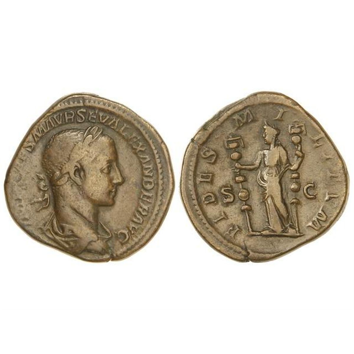 Sestercio. - 222-235 d.C. - ALEJANDRO SEVERO. - Anv.: IMP. CAES. M. AVR. SEV. ALEXANDER AVG. Busto laureado a derecha. Rev.: FIDES MILITVM S. C. Fe en pie a izquierda con dos estandartes. 25,90 grs. MBC. - -