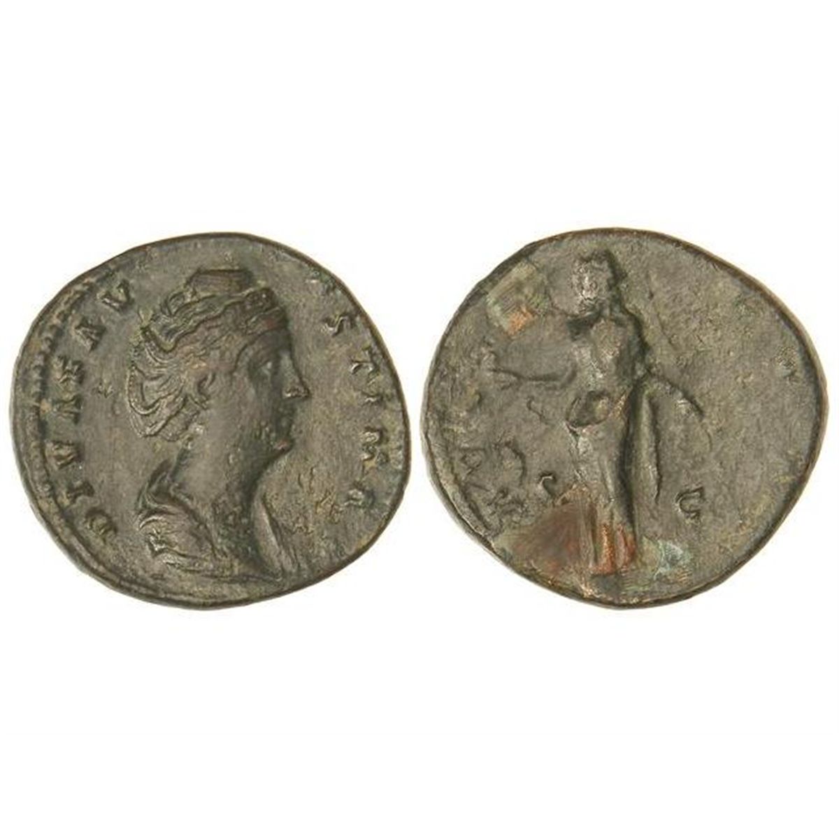 Sestercio. - Acuñación posterior al 141 d.c. - FAUSTINA MADRE. - Anv.: DIVA FAVSTINA. Busto a derecha. Rev.: AVG(V)STA S. C. Vesta en pie a izquierda con paladión y cetro. 24,90 grs. Pátina verde. (Pátina reparada en reverso y empastada). C-110. (MBC+/MBC-. - -