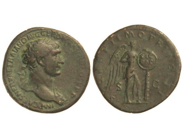 Sestercio. Acuñada el 104-110 d.C. TRAJANO. Anv.: IMP. CAES. NERVAE TRAIANO AVG. GER. DAC. P. M. TR. P. COS. V. P. P. Busto laureado a derecha. Rev.: S. P. Q. R. OPTIMO PRINCIPI S. C. Victoria a derecha inscribiendo VIC. DAC. en escudo adosado a palmera. 24,30 grs. C-454. MBC+.