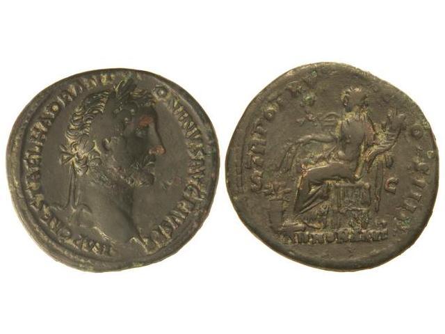 Sestercio. Acuñada el 151-152 d.C. ANTONINO PÍO. Anv.: IMP. CAES. T. AEL. HADR. ANTONINVS AVG. PIVS P. P. Busto laureado a derecha. Rev.: TR. POT. XV COS. IIII ANNONA AVG. S. C. Annona sentada a izquierda, modio a sus pies. 28,22 grs. Pátina verde oscura. (Leves oxidaciones). C-50. (MBC+)/MBC-.