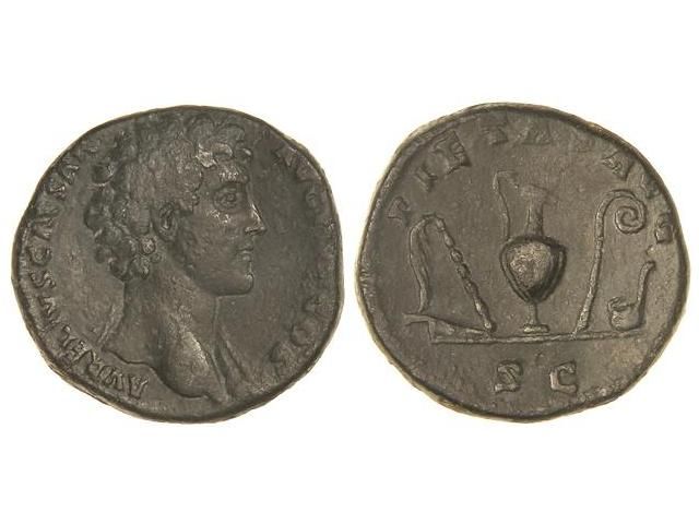 Sestercio. Acuñada el 161-180 d.C. MARCO AURELIO. Anv.: AVRELIVS CAESAR AVG. PII F. COS. Busto joven descubierto a derecha. Rev.: PIETAS AVG. S. C. Instrumentos sacerdotales. 25,26 grs. Pátina negra. C-454 var. MBC.