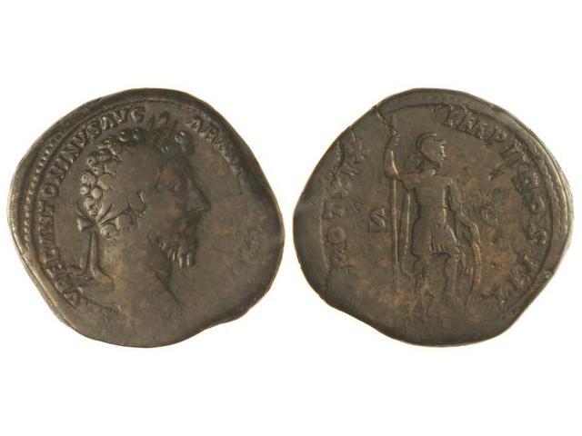 Sestercio. Acuñada el 164-165 d.C. MARCO AURELIO. Anv.: M. AVREL. ANTONINVS AVG. ARME(NIACVS P. M.). Busto laureado a derecha. Rev.: TR. POT. XIX IMP. II COS. III S. C. Marte en pie a derecha con lanza y escudo. 33,30 grs. Pátina oscura. C-796. BC+.