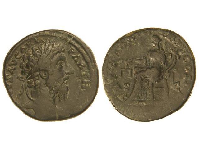 Sestercio. Acuñada el 168 d.C. MARCO AURELIO. Anv.: (M. ANTONINVS) AVG. ARM. PARTH. (MAX.). Cabeza laureada a derecha. Rev.: TR. POT. (...) IMP. V COS. III S. C. Equidad sentada a izquierda. 22 grs. Pátina oscura. C-820. (MBC+).