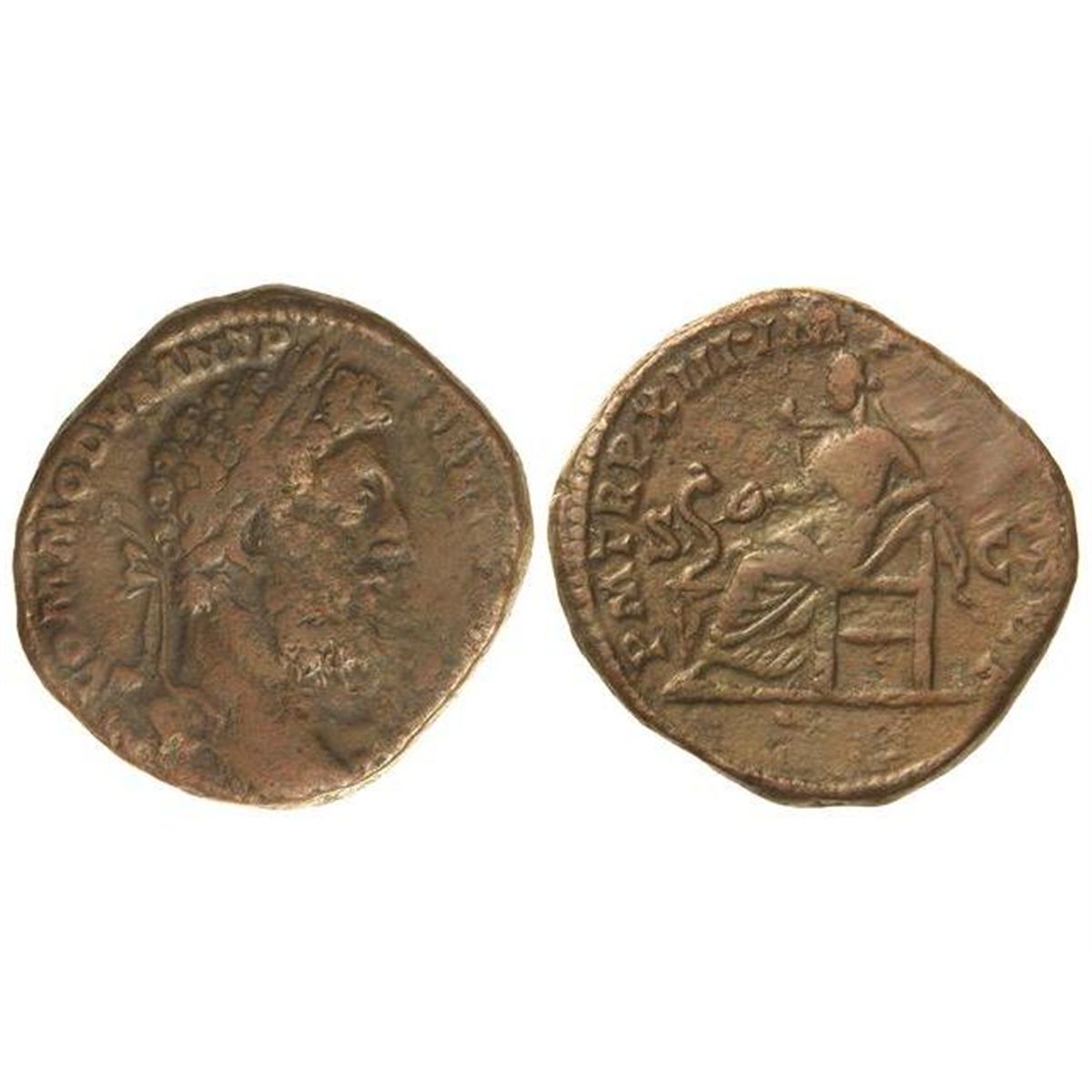 Sestercio. - Acuñada el 187-188 d.C. - CÓMODO. - Anv.: M. COMMODVS ANT. P. FELIX (AVg. BRIT.). Cabeza laureada a derecha. Rev.: P. M. TR. P. XIII IMP. (VIII COS. V P. P. S. C.). Salud sentada, dando de comer a una serpiente. 24,85 grs. (Leves oxidaciones). C-545. MBC-. - -