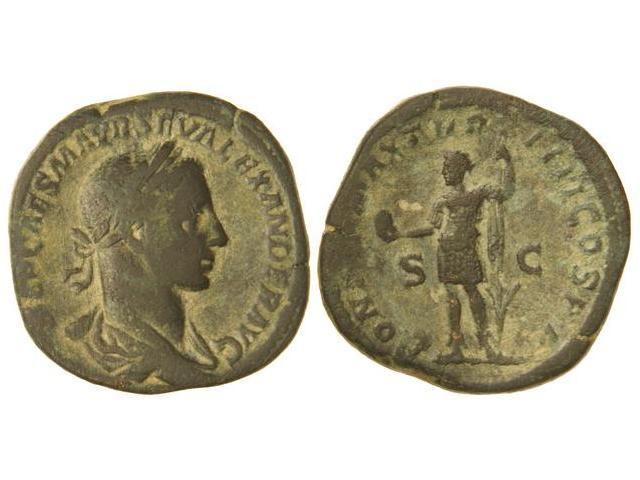 Sestercio. Acuñada el 225 d.C. ALEJANDRO SEVERO. Anv.: IMP. CAES. M. AVR. SEV. ALEXANDER AVG. Busto laureado a derecha. Rev.: PONTIF. MAX. TR. P. IIII COS. P. P. S. C. Alejandro Severo en pie en atuendo militar a izquierda con lanza y globo. 23,40 grs. Pátina negra. C-477. (MBC+).