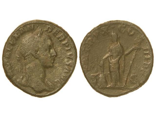 Sestercio. Acuñada el 231 d.C. ALEJANDRO SEVERO. Anv.: IMP: ALEXANDER PIVS.AVG. Busto laureado a derecha. Rev.: P. M. TR. P. X COS. III P. P. S. C. Annona en pie a izquierda. Pátina oscura. C-422. MBC-.