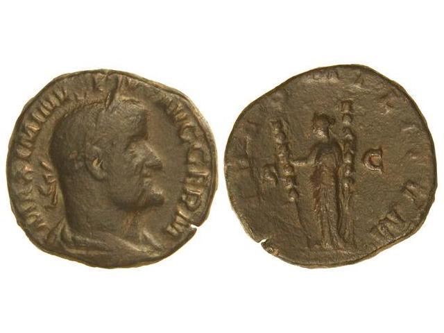 Sestercio. Acuñada el 235-236 d.C. MAXIMINO I. Anv.: MAXIMINVS PIVS AVG. GERM. Cabeza laureada a derecha. Rev.: FIDES MILITVM S. C. Fe estante a izquierda portando dos estandartes. 17,60 grs. C-10 var. MBC/MBC-.