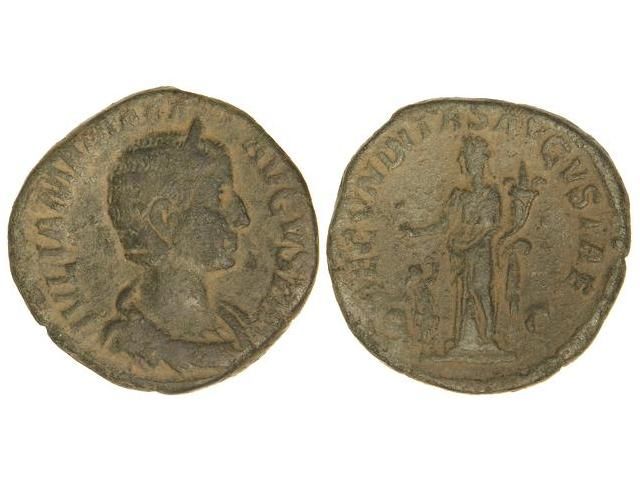 Sestercio. Acuñada el 235 d.C. JULIA MAMEA. Anv.: IVLIA MAMAEA AVGVSTA. Busto diademado. Rev.: FECVNDITAS AVGVSTAE. Fecundidad en pie a izquierda con cornucopia y niño a sus pies. 20,61 grs. Pátina verde. C-8. (MBC+).