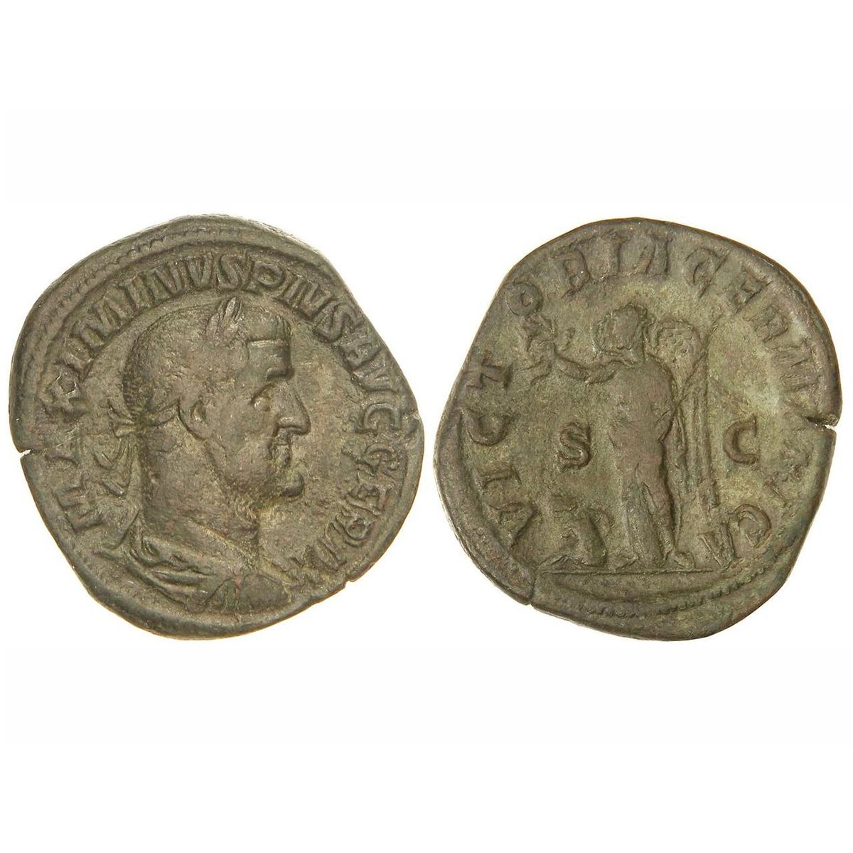 Sestercio. - Acuñada el 236-238 d.C. - MAXIMINO I. - Anv.: MAXIMINVS PIVS AVG. GERM. Bsuto laureado a derecha. Rev.: VICTORIA GERMANICA S. C. Victoria en pie con palma y corona a izquierda, cautivo a sus pies. 24,60 grs. Pátina verde. C-109. MBC+. - -