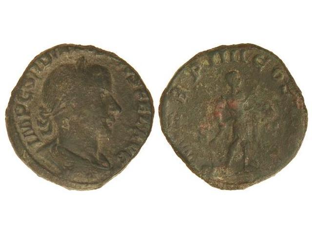 Sestercio. - Acuñada el 241-243 d.C. - Anv.: IMP. GORDIANVS PIVS FEL. AVG. Busto larueado a derecha. Rev.: P. M. TR. P. IIII COS. II P. P. S. C. Gordiano estante a derecha, portando lanza y globo. 19,90 grs. C-254. MBC/MBC-. - -