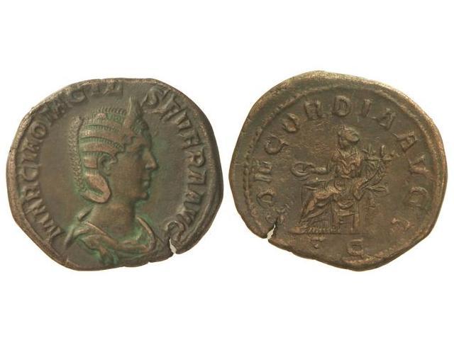 Sestercio. Acuñada el 244-249 d.C. OTACILIA SEVERA. Anv.: MARCIA OTACIL. SEVERA AVGG. Busto diademado a derecha. Rev.: CONCORDIA AVGG. S. C. Concordia sedente a izquierda, portando pátera y doble cornucopia. 19,76 grs,. (Grieta). C-10. MBC+.