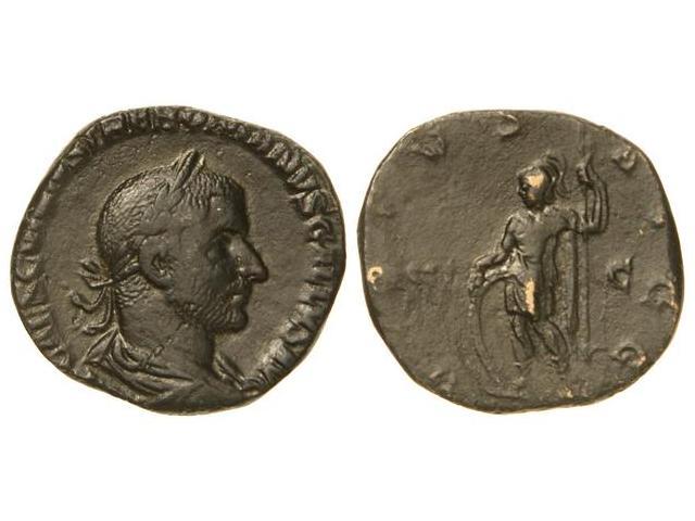 Sestercio. Acuñada el 251-253 d.C. TREBONIANO GALO. Anv.: (IMP.) CAES. C. VIBIVS TREBONIANVS GALLVS AVG. Busto laureado a derecha. Rev.: VIRTVS AVGG. S. C. Virtud en pie a izquierda. Pátina oscura. C-134. MBC/MBC-.