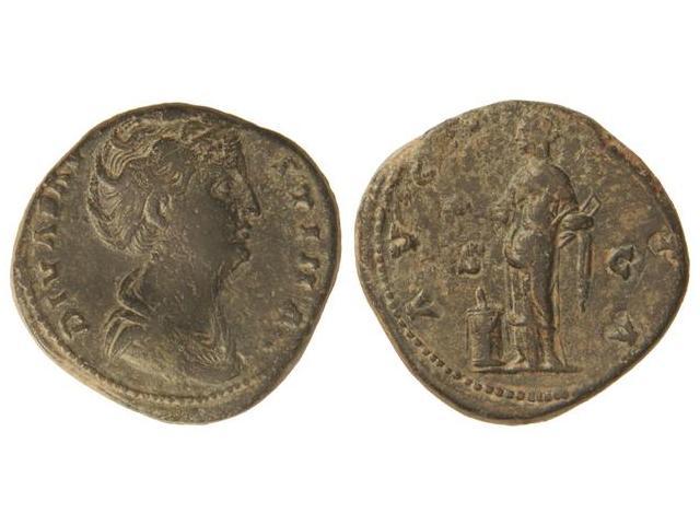 Sestercio. Acuñada posterior 141 d.C. FAUSTINA MADRE. Anv.: DIVA FAVSTINA. Busto a derecha. Rev.: AVG(VS)TA S. C. Vesta en pie a izquierda con pátera y paladión, altar a sus pies. 25,60 grs. Pátina verde. C-117. (MBC).