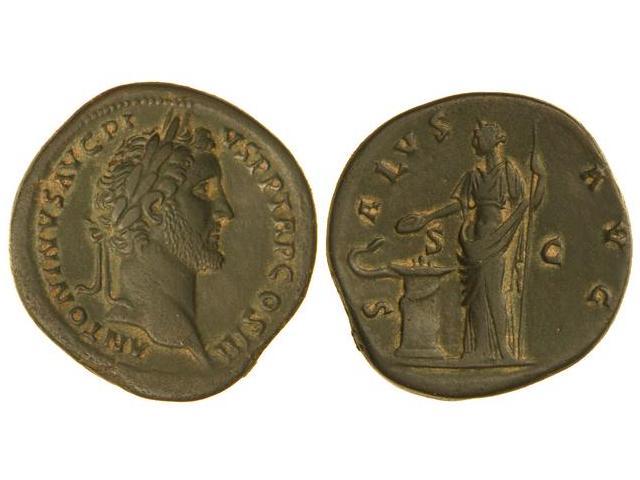 Sesterecio. Acuñada el 143 d.C. ANTONINO PÍO. Anv.: ANTONINVS AVG. PIVS P. P. TR. P. COS. III. Busto laureado a derecha. Rev.: SALVS AVG. S. C. Salud en pie a izquierda dando de comer a una serpiente sobre atar. 26 grs. Pátina verde oscura. C-718. EBC-/MBC+.