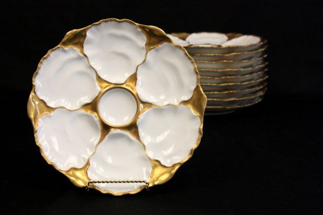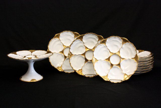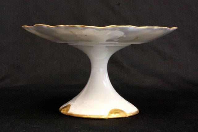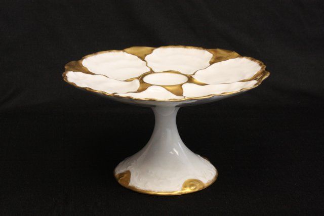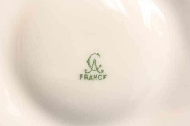 Compote is on a pedestal. Signed "CA France", retailed by Salviati & Co. Venice. Plates approx. 9" W, compote 9" W x 5" H. Please read our terms of sale.