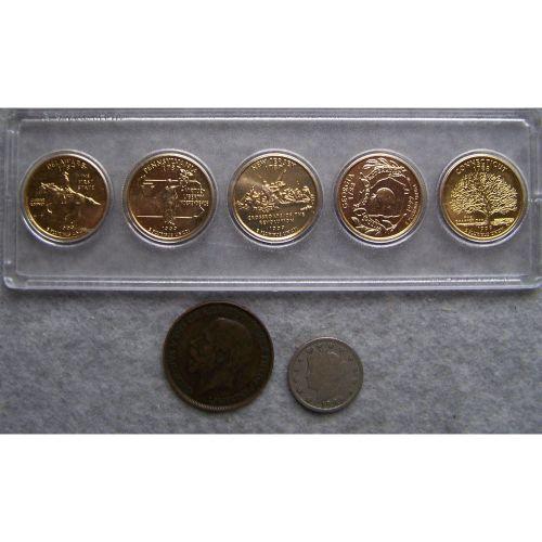 Set 1999 Gold Colored Statehood Quarters, 1912 UK Cent & 1905 Liberty Nickel