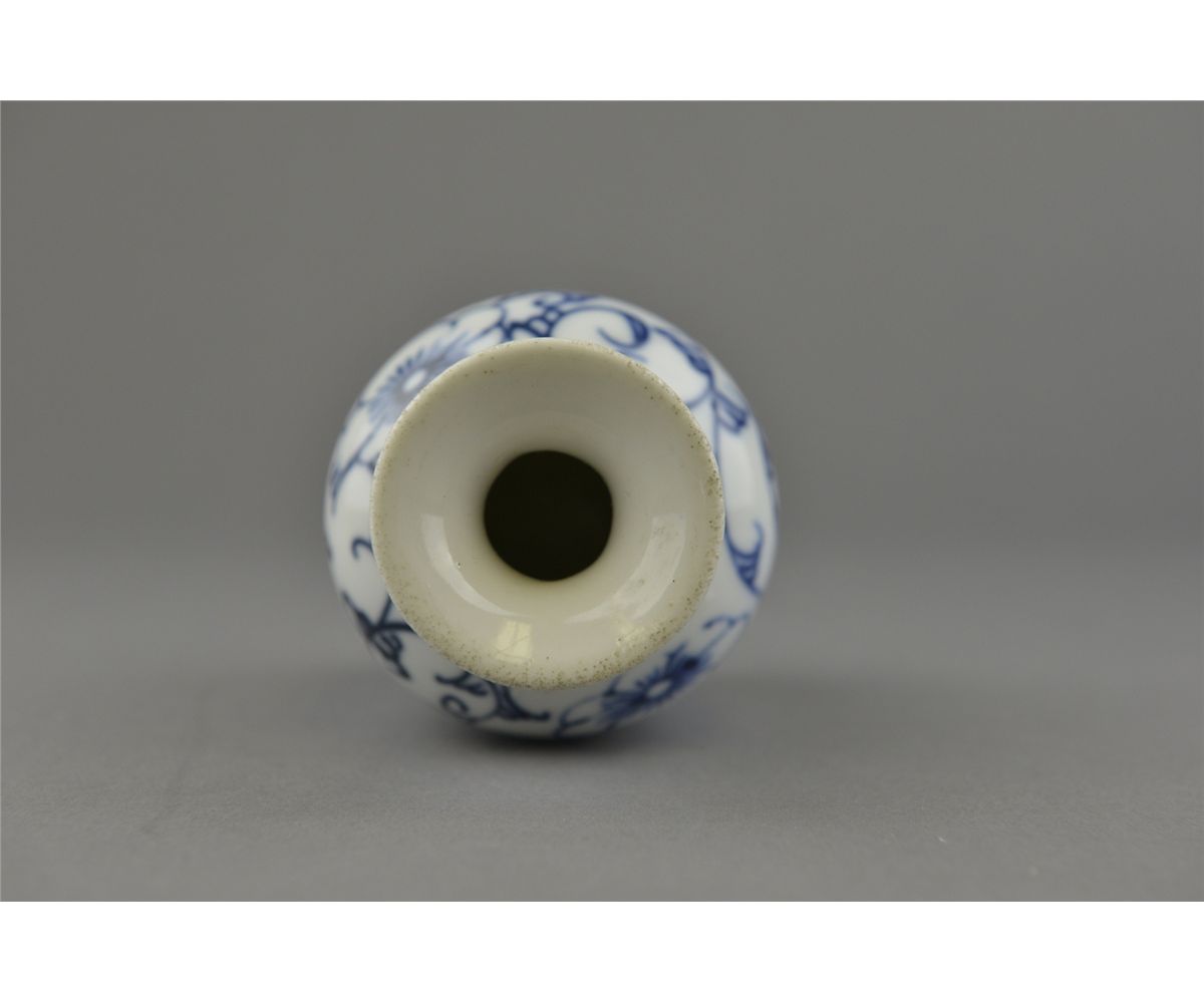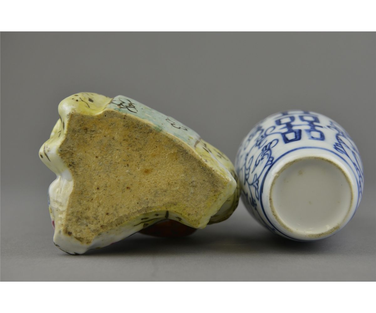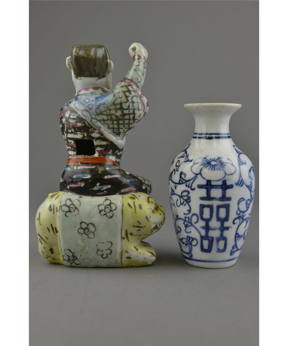 Set of two Chinese porcelain pieces; one featuring figure of Immortal in enameling; small Chinese blue and white porcelain vase, ovoid body featuring double happiness symbol; H: 17 cm (figure); H: 12 cm (vase)