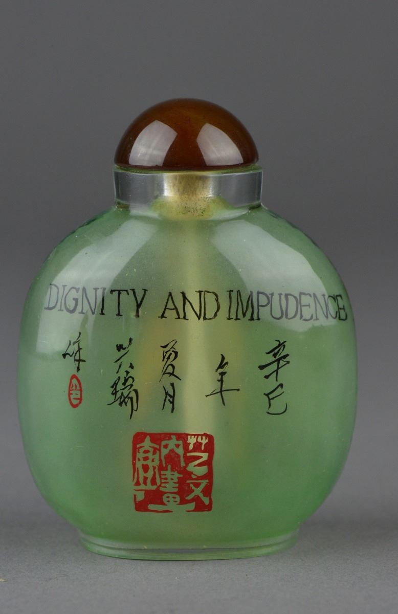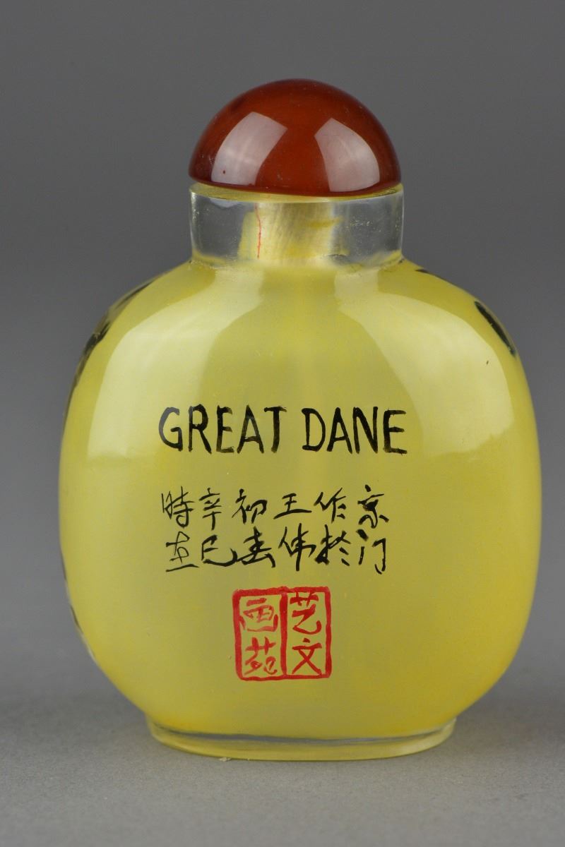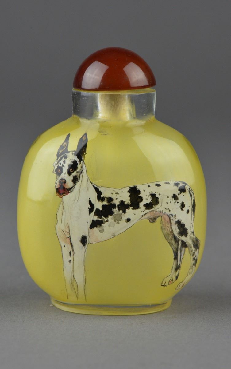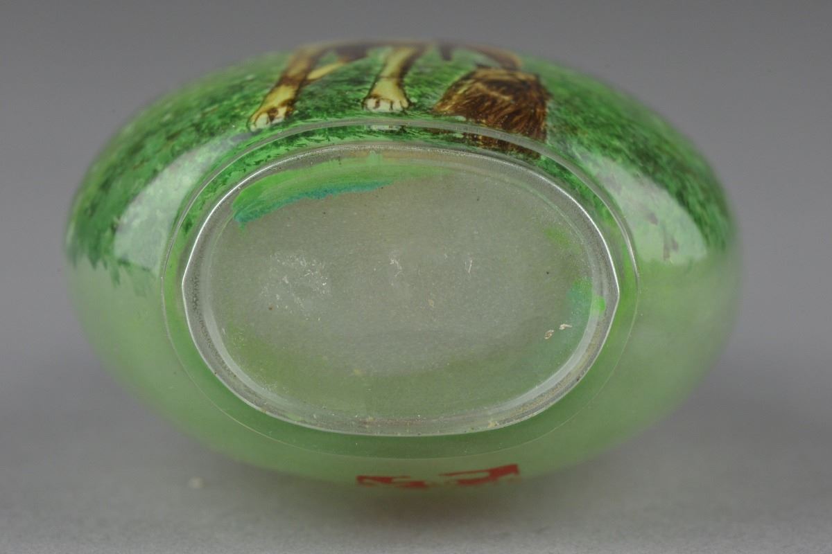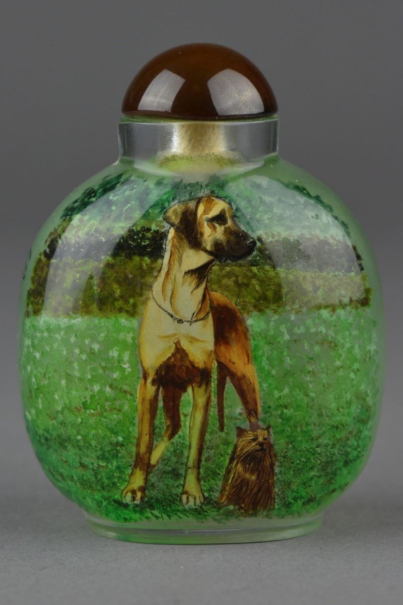Set of two Chinese reverse painted glass snuff bottles; featuring cow and dog interior painting; H: 8 cm (each)