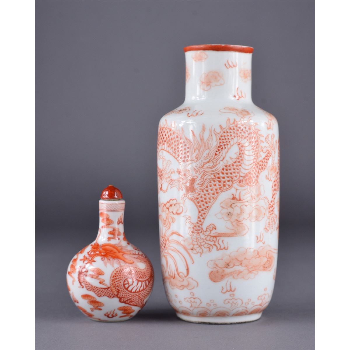 Set of two Chinese copper red glazed porcelain brush pot and snuff bottle; both featuring five-toed dragons; four-character Qianlong Mark on base of snuff bottle; H: 15 cm, D: 6.5 cm (brush pot); H; 8 cm, D: 5 cm (snuff bottle)