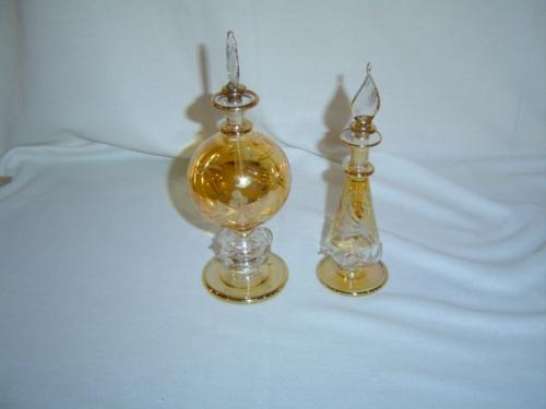 Set includes one 7.5" and one 6.5" gold tone Egyptian Perfume Bottle with glass stopper. Each perfume bottle, individually crafted of hand-blown glass, hand-painted and accented in 24k gold, is a one-of-a-kind piece of art. Passed down from generation to generation from the Pharoahs, this unique, sensual tradition is truly and egyptian treasure.