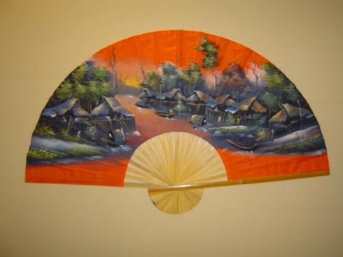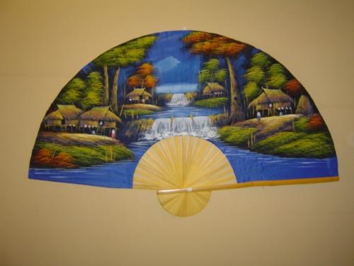 Two hand painted wall fans from Thailand, 60"W X 35"H, depicting traditional village scenes.
