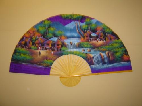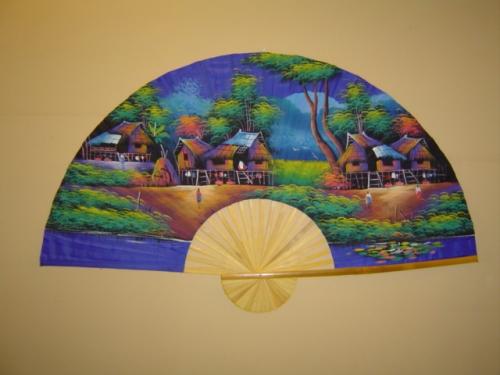 Two hand painted wall fans from Thailand, 60"W X 35"H, depicting traditional village scenes.