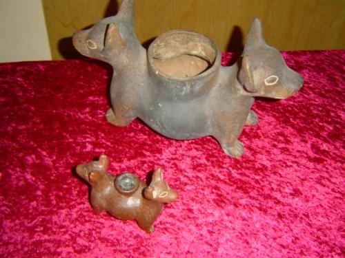 Pottery Double Headed Xolo Pot, 7.5" tall X 12.5"w X 6"d and a small pottery Xolo Dog candleholder, 3.5" X 5.5" X 2.5"