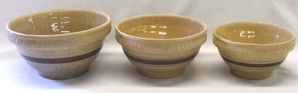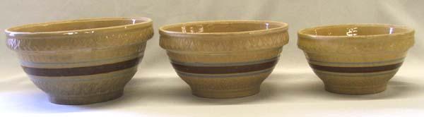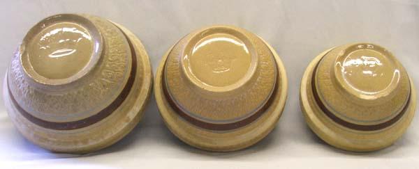 Set Of 3 Antique Graduated Yellow Ware Banded Bowls with embossed crown hallmark on the bottom of the bowls. Large bowl has minor chipping on rim and bottom and small bowl has some chipping on the bottom. Largest bowl measures approx. 4 7/8''H x 9.5''Diameter. Buyers Pay Actual Shipping and Handling Charges(see terms and conditions for more information).