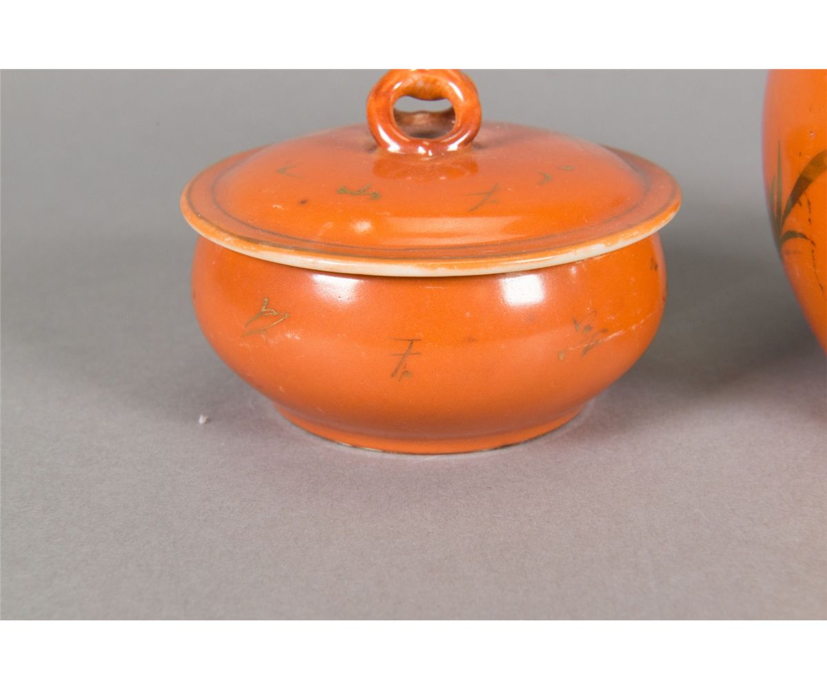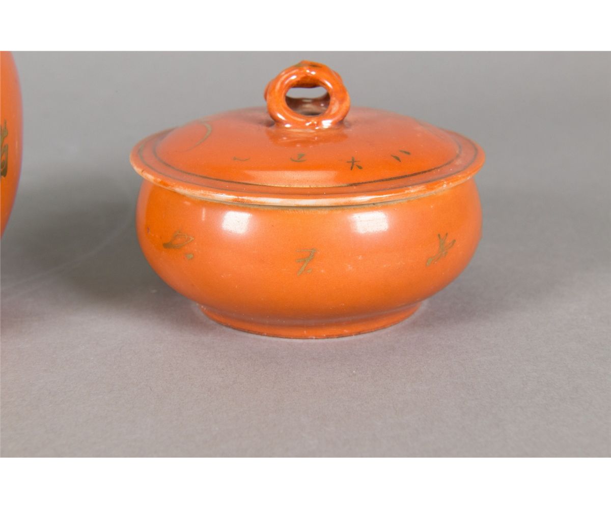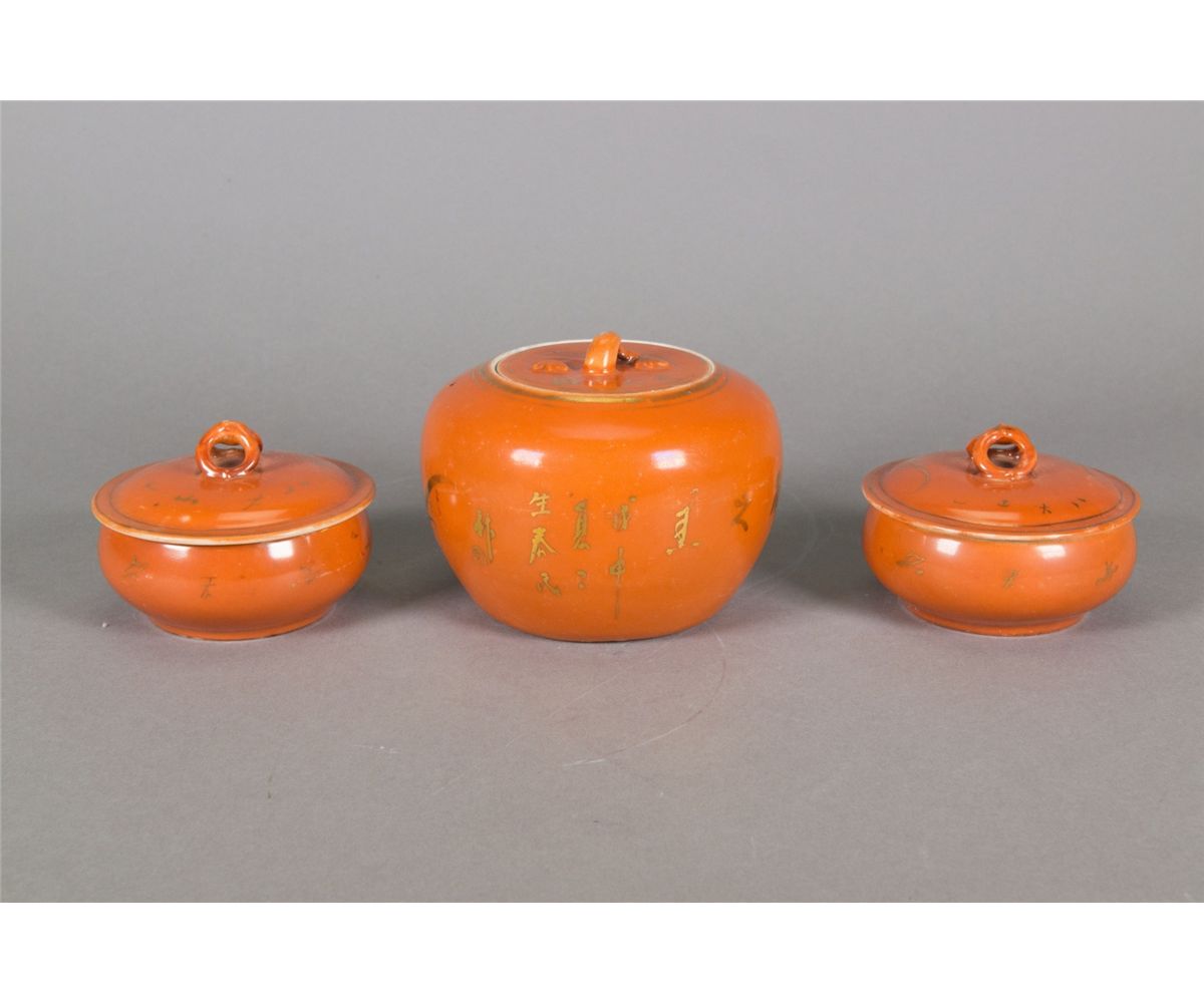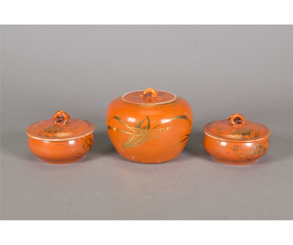 Set of three Chinese red ground gilt bowl with lids; comprised of two bowls and one jar; featuring orchid on body; golden appraised seals inside the lids; H: 9 cm, D: 12 cm, 464 grams
