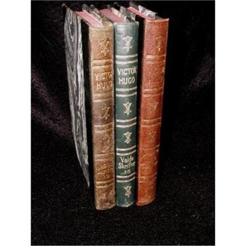 Beautiful set of 3 leather bound Swedish books by Victor Hugo. Two leather bond spine in brown with black cover and corner,the third in black with same. Gold lettering and symbols. Marbleized covers in bold black and white. The trio printed 1926. Attributed to Malmo Vitruss Peterssons Litografafiska Trycckeeri. Titled "Samhallets Olyuccksban" Hovdingen" and Valda Skriffer". All three pet8ie size which make a great decorative accent if unable to read. Excellent condition. Measure 5W X 6.5H X .75D