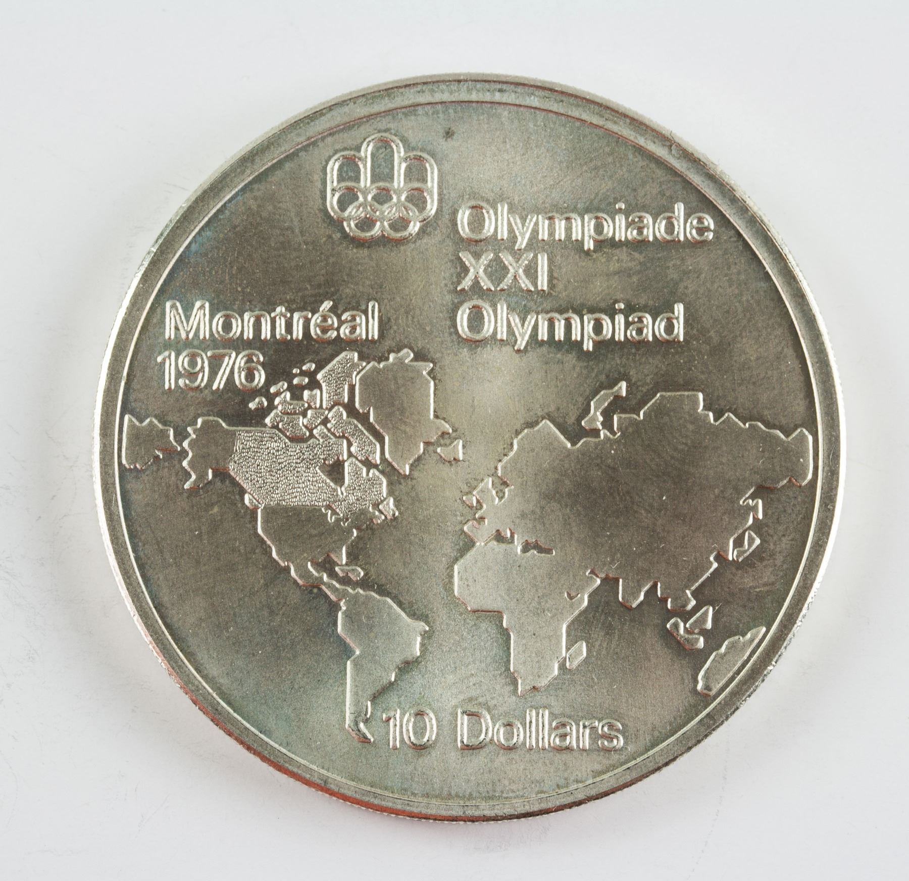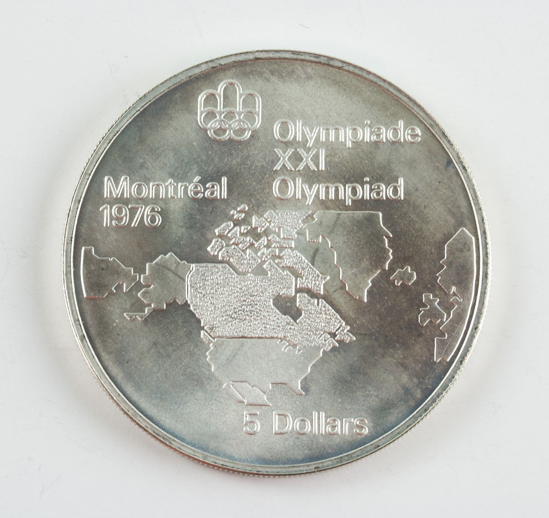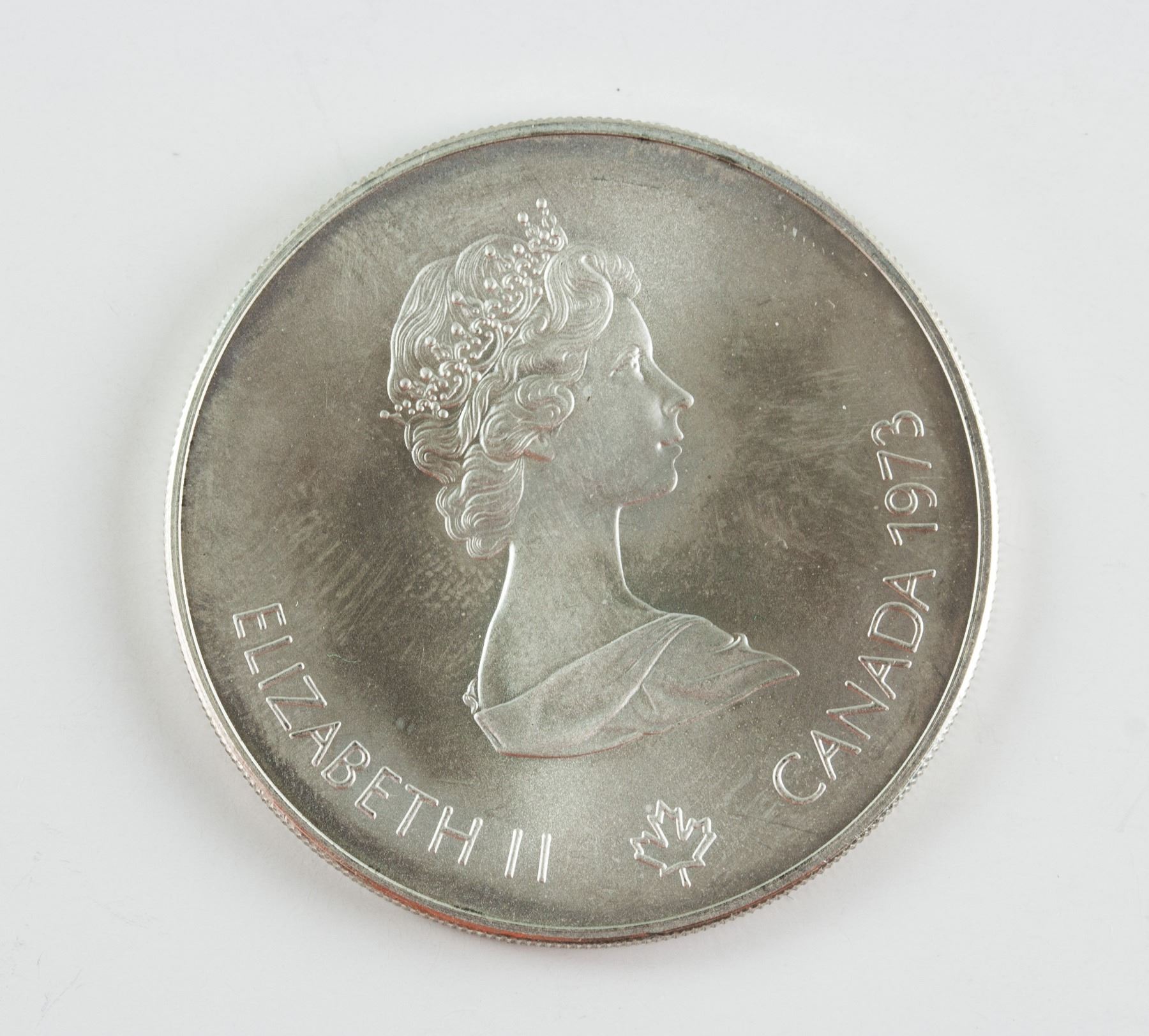 4 pieces of assorted 1973 Canada non circulating sterling silver (.925) coin; commemorative issue 1976 Montreal Olympics; of 2 pieces of 5 Dollar and 2 pieces of 10 Dollars; obverse all engraved effigy of Queen Elizabeth II facing right, lettering ELIZABETH II CANADA 1973; reverse engraved map of North America, sailing boats, map of world, Montreal skyline; lettering Olympiade XXI, Montreal Olympiad, 1976; reeded edge; 3.8 cm- 4.5 cm, Total: 147 grams