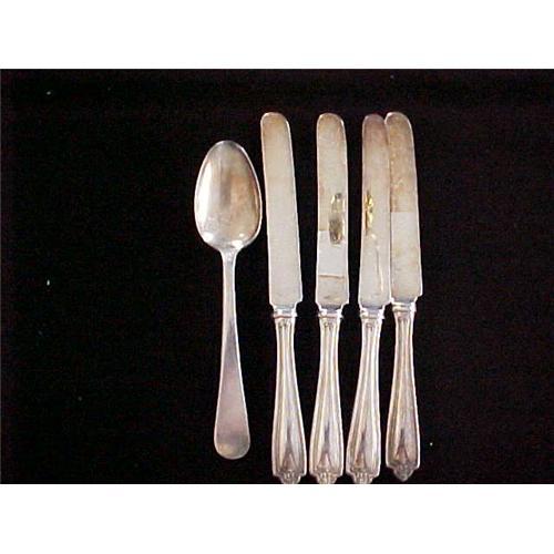 Set 4 Hollow Handle Knives & Signed Victors Co A+ Overlay Serving Spoon. The is my first time with Victors Co. Very plain 7" tablespoon. Knives are 8.5". All show use but mostly need a good polishing. Knives are unsigned.