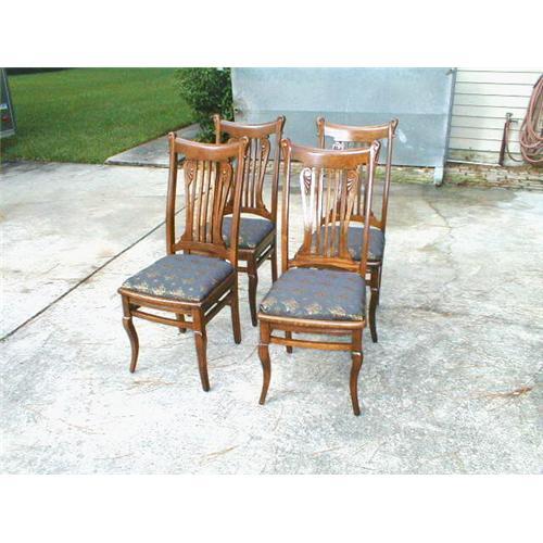 Here is a set of 4 large, quarter sawn oak dining chairs. These chairs are almost 43 inches tall and 18 inches wide. Each chair has a heavy square, multi- slatted back with carved decoration in the back and on the top rung. The front legs are done in a very gracefull cabriole design. Each chair has a newly upholstered seat with 2 inchs of padding. These chairs are refinished and reglued as necessary to provide you a quality chair. Chairs this large and this elegant are hard to find !!!