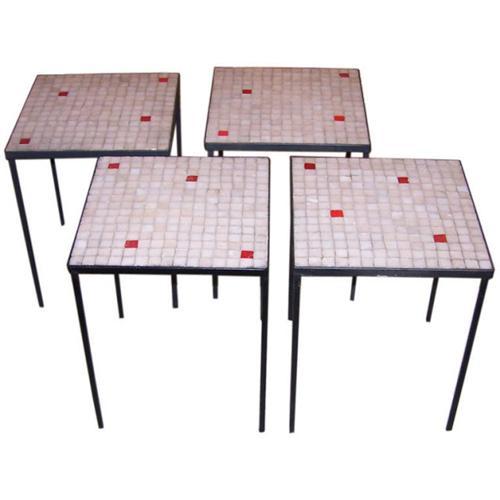 Set of four drink or end table in style of Paul McCobb. Glass tiles in iron frame.