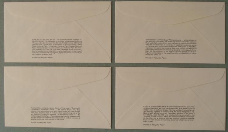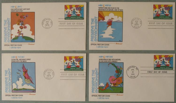 This is a set of four First Day Covers from the Preserve the Environment series created by legendary artist Peter Max. These are from Expo 74, and each has a different cover. They have identical 1974 post marks from Spokane, Washington, and stamps. They are in very good condition. * These will be great for World's Fair or stamp collectors, or any fan of Peter Max.