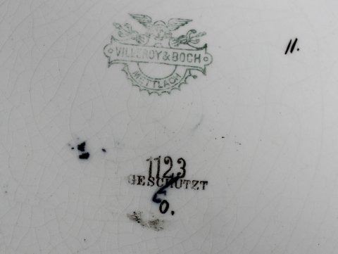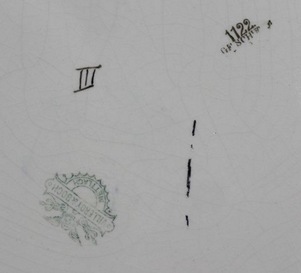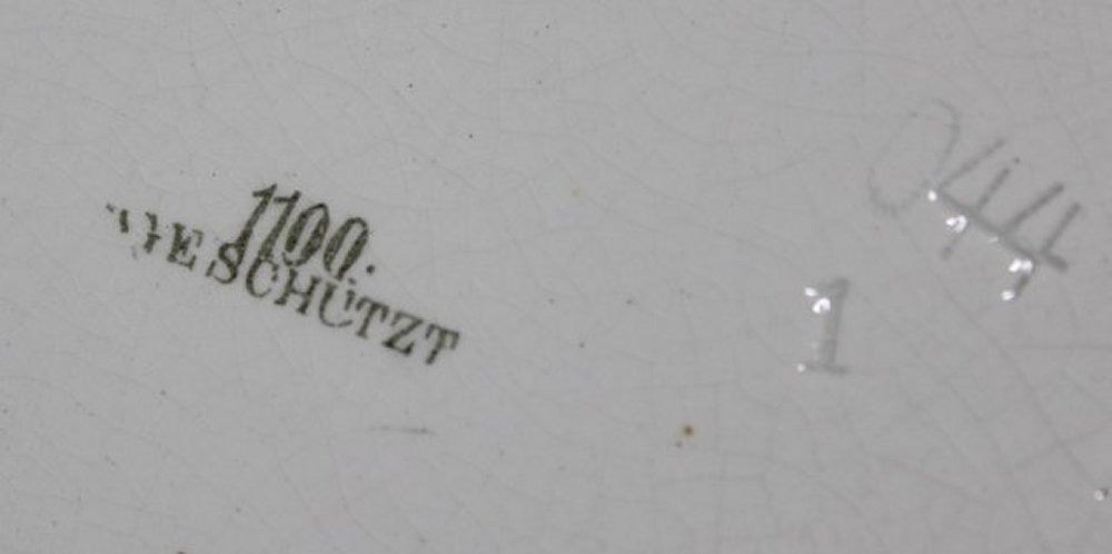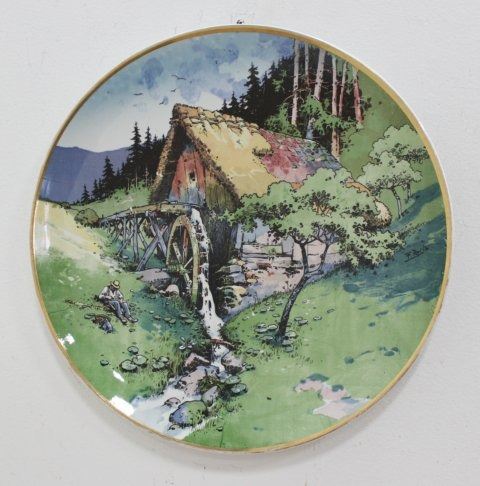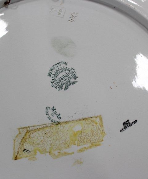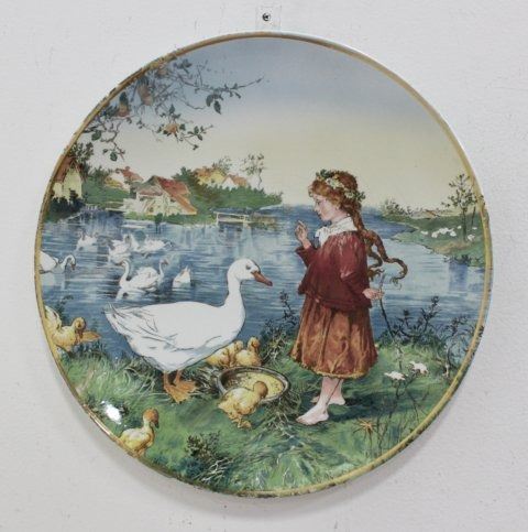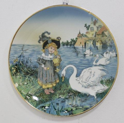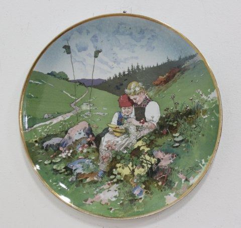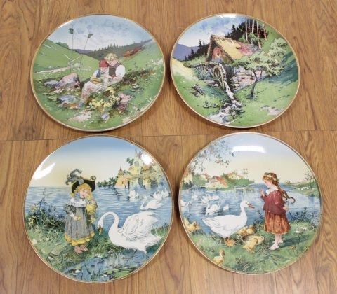 Each decorated with children in farm scenes. 2 signed F. Reils, 2 signed Heinrich Schlitt. Approx. 17" diameter. From an Edgewater, NJ estate. Some craquelure. Gilding worn on edges.