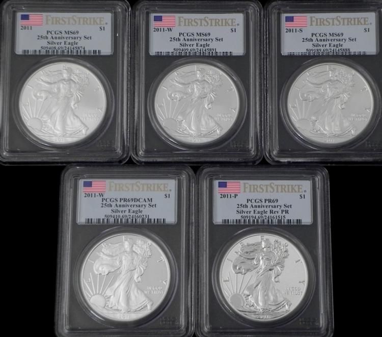 5 piece set 25th Anniversary First Strike Silver Eagles * 2011, MS692011-W, MS692011-S, MS692011-W, PR69 DCAM Proof2011-P, PR69 ProofGraded by: Professional Coin Grading Service