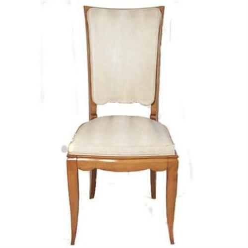 This listing includes a set of six (6) French Art Deco dining chairs. Circa 1930s. Recently imported from Paris. They feature high seatbacks and lovely tapered legs. Measurements: 38.5" high by 17.5" wide by 18.5" deep. Original padding and creamy white vinyl upolstery is in good physical condition. However, the upholstery reflects its age and requires a thorough cleaning or possible replacement. Thanks for visiting, and please feel free to contact us with any comments or questions.
