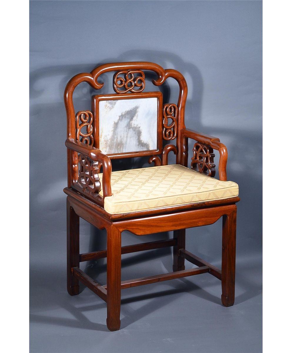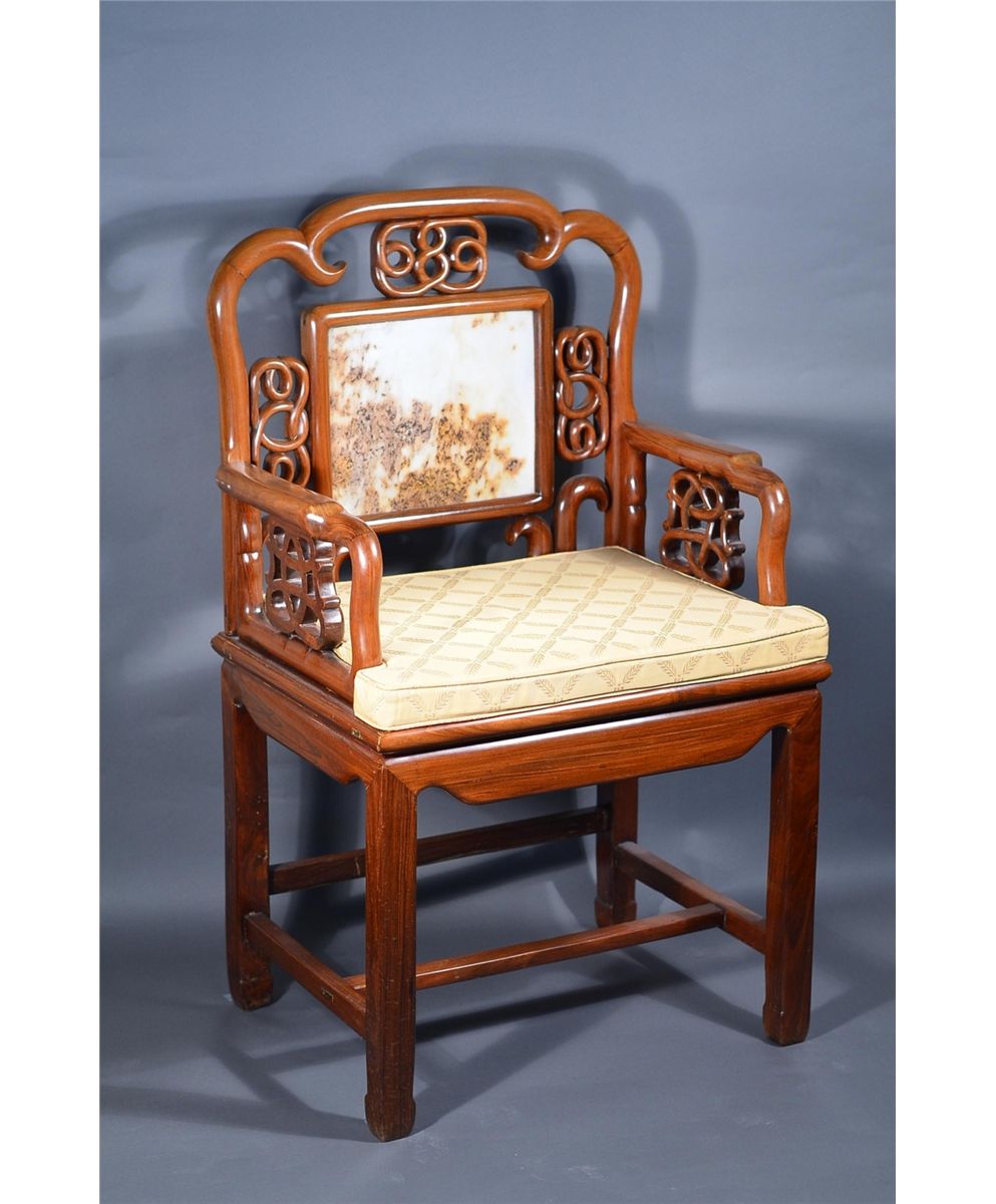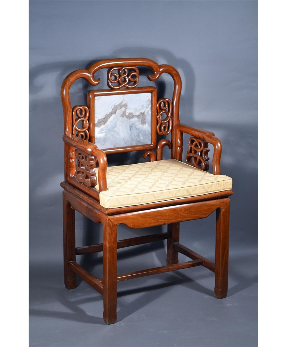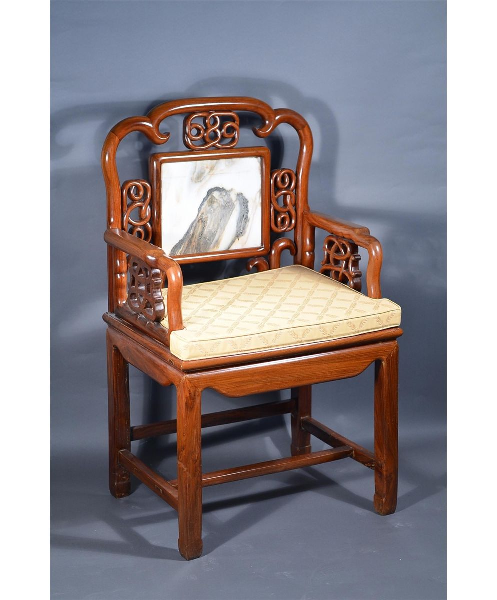 A finely crafted set of six Chinese carved Qing Period yellow rosewood Hongmu chairs; each chair carved with openwork backs inset with rectangular marble dreamstone, flanked by arm rests and raised on four legs; sturdy construction with NO NAILS; finely persevered and in excellent condition; subtle but distinct smell of wood and no evidence of the application of lacquer, 19th/20th Century; L: 61 cm, W: 48 cm, H: 104 cm; Provenance: Richmond Hill Estate