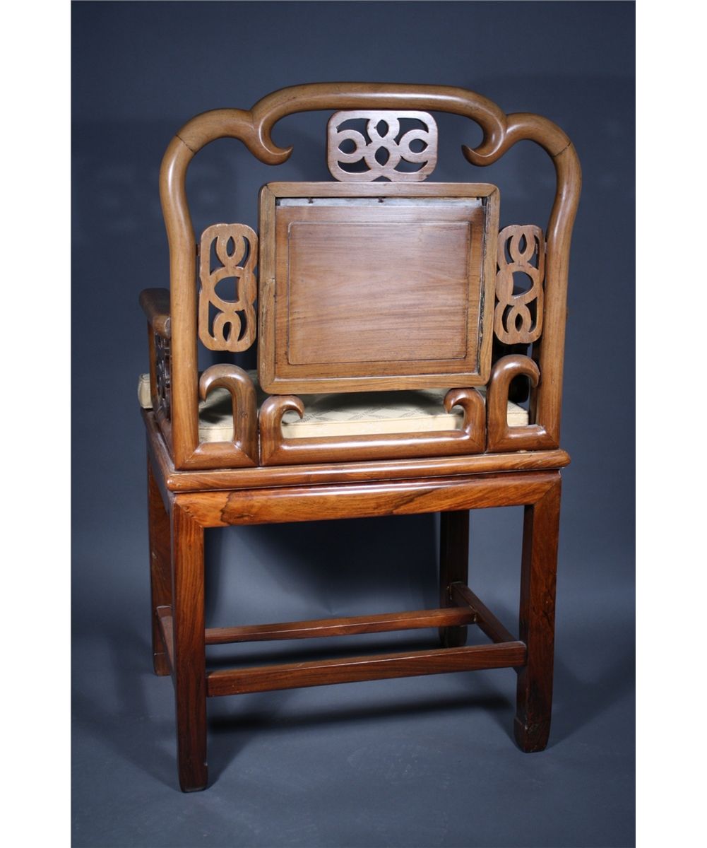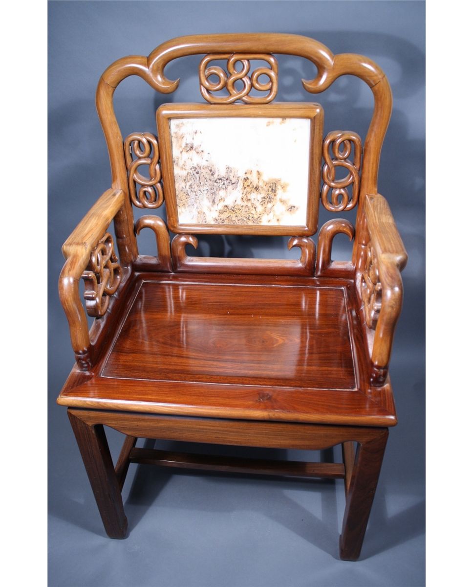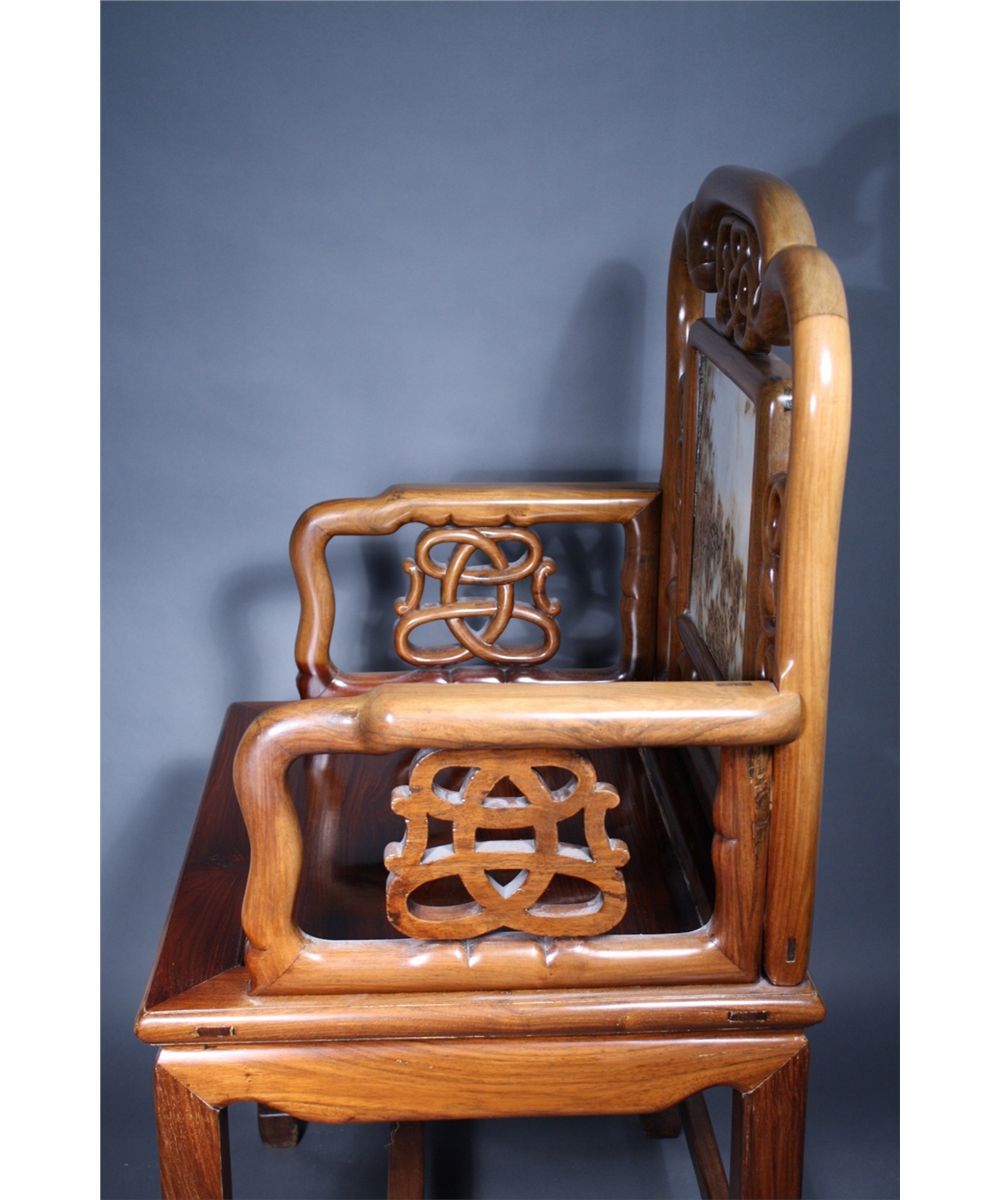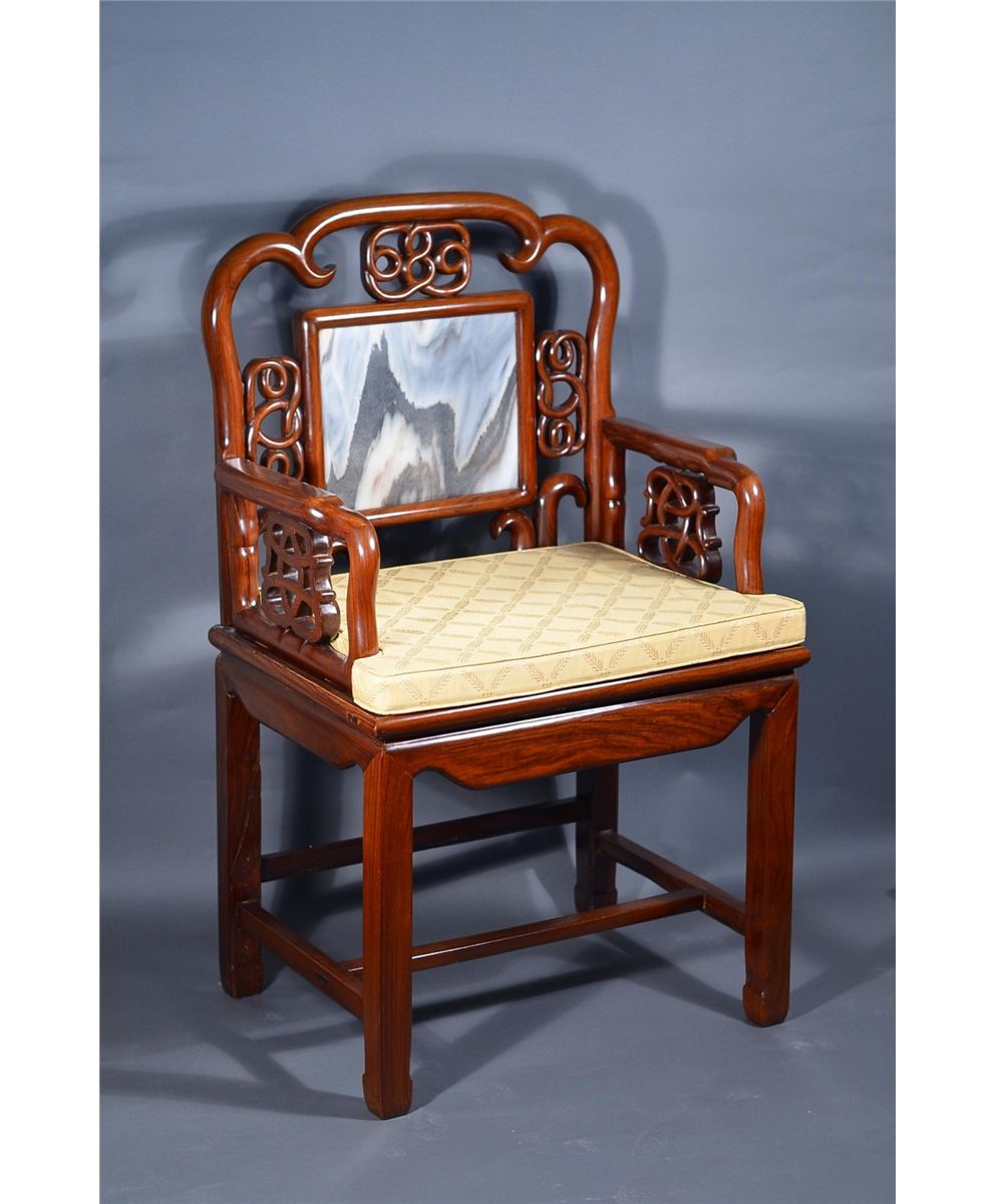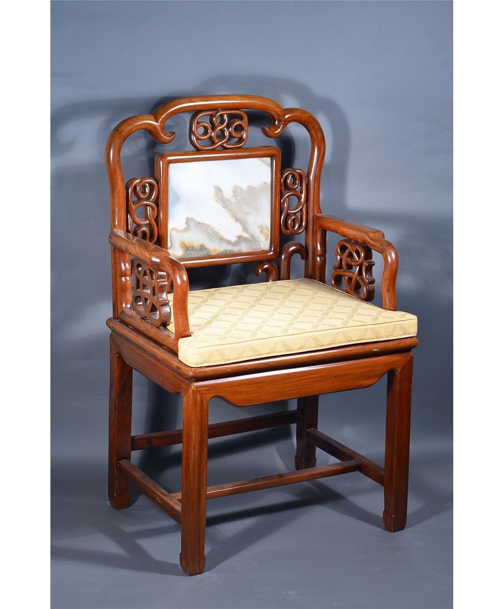 A finely crafted set of six Chinese carved Qing Period yellow rosewood Hongmu chairs; each chair carved with openwork backs inset with rectangular marble dreamstone, flanked by arm rests and raised on four legs; sturdy construction with NO NAILS; finely persevered and in excellent condition; subtle but distinct smell of wood and no evidence of the application of lacquer, 19th/20th Century; L: 61 cm, W: 48 cm, H: 104 cm; Provenance: Richmond Hill Estate