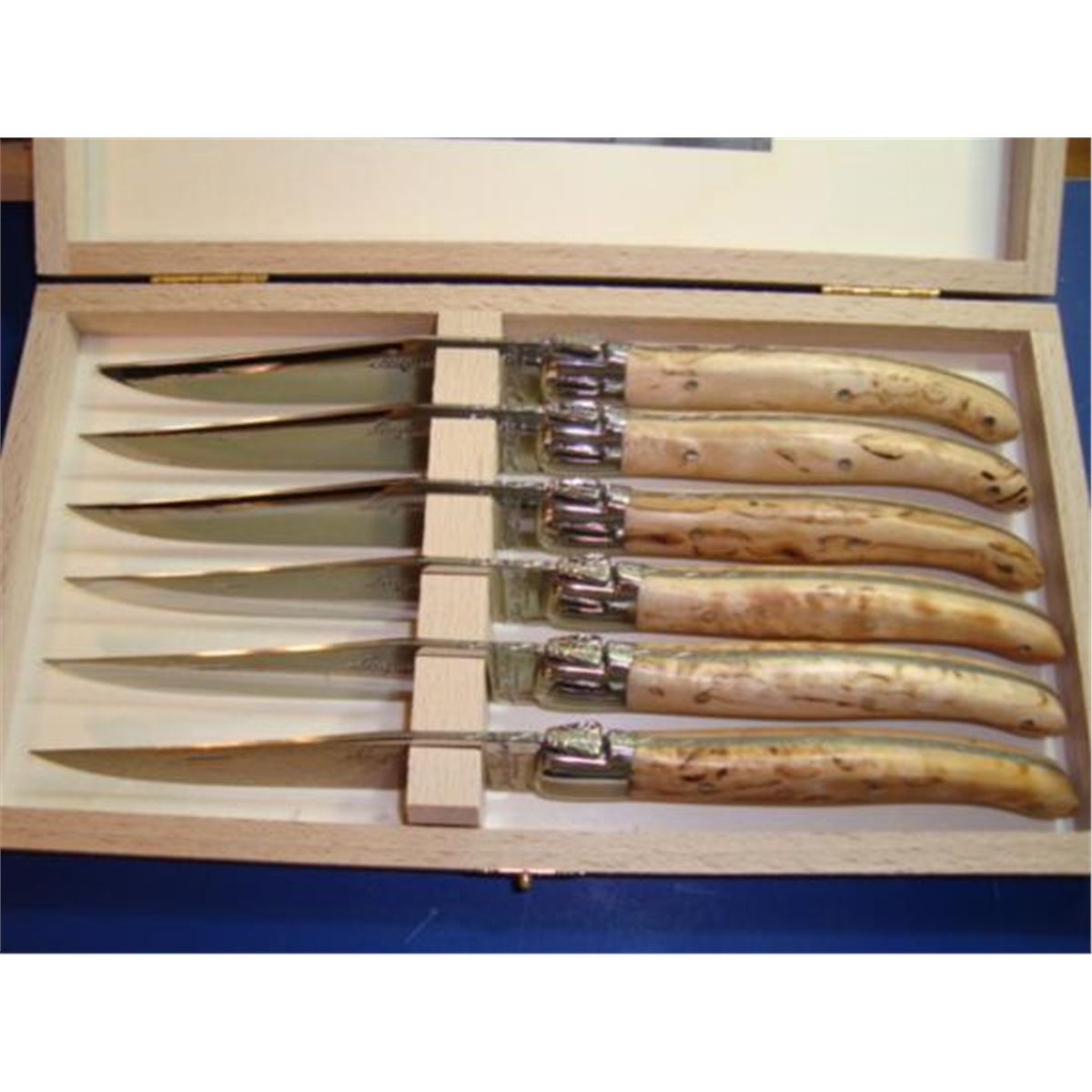Set of 6 French Laguiole steak knives designed by Jean Dubost with its "Authenticity Certificate" DUBOST COLAS PRADEL was created in 1920, by Pierre DUBOST and his wife Marcelle COLAS PRADEL. The VERY FAMOUS set of 6 French steak-knives "LAGUIOLE"...with Authenticity Certificate. The handle was made of Norvegian birchwood & the blade made of very high grade stainless steel was stamped, ground and polished with 25 different manual production stages. Blade: 4.5"/ total: 9.25"The world renowned knives has been crafted in the heart of France for over 200 years. This Company was created in 1920, in the capital of French cutlery (Auvergne, center-France). These knives are the result of a family tradition of fine workmanship and very high quality products. Dubost Colas Pradel is situated in Viscomtat, a mountain village 15km from Thiers, the capital of french cutlery. Ever since its foundation in 1920 by Pierre Dubost and his wife Marcelle Colas Pradel, the company has passed down a family tradition of fine workmanship and high quality products. It is now in the hands of the third (Philippe Dubost) and the fourth (Alexandre Dubost) generations. The company has grown in notoriety due to being attentive to the changing needs of consumers, and its faithful presence at international fairs since 1962. Since its creation Dubost Colas Pradel has been in a perpetual development. Despite having started in a small workshop, production grew rapidly under the inspiration of Jean Dubost, the founder's son, who gave his name to the famous flatware line and the world renowned kitchen knives. Quality is an integral part of the company policy. Products are quality controlled at each step of production, with care to assure good workmanship, in order to provide consumers with pleasure and the assurance of long lasting use.Ref #98/13342 /**ThinViewJs**/ var ifr = function() {}; ifr.browserDetect = function() {this.bFirefox = this.bWebTV = this.bOpera = this.bNav = this.bIE = this.bSafari =this.bWin = this.bMac = this.bMacppc = this.bMactel =this.bWinXp = this.bXpSp2 = this.bAOL = this.bVista = false;this.iVer = this.fVer = -1;this.fMinorVer = 0;this.init = function() {var nv = navigator, agt = nv.userAgent.toLowerCase(), i = 0, ver;with (this){if (agt.indexOf('webtv') != -1){bWebTV = true;i = agt.indexOf('webtv/') + 6;}else if (agt.indexOf('firefox') != -1){bFirefox = true;i = agt.lastIndexOf('firefox') + 8;}else if (agt.indexOf('safari') != -1){bSafari = true;i = agt.lastIndexOf('safari') + 7;}else if(typeof(window.opera)!='undefined'){bOpera = true;i = agt.lastIndexOf('opera') + 6;}else if (nv.appName == 'Netscape'){bNav = true;i = agt.lastIndexOf('/') + 1;}else if (agt.indexOf('msie') != -1){bIE = true;i = agt.indexOf('msie') + 4;if ((agt.indexOf('aol') != -1) || (agt.indexOf('america online') != -1))bAOL = true;}ver = bOpera?window.opera.version():agt.substring(i);iVer = parseInt(ver);fVer = parseFloat(ver);fMinorVer = fVer - iVer;bWin = (agt.indexOf('win') != -1);bWinXp = (bWin && (agt.indexOf('windows nt 5.1') != -1));bVista = (bWin && (agt.indexOf('windows nt 6.0') != -1));bXpSp2 = (bWinXp && (agt.indexOf('sv1') != -1));bMac = (agt.indexOf('mac') != -1);bMacppc = (bMac && ((agt.indexOf('ppc') != -1) || (agt.indexOf('powerpc') != -1)));bMactel = (bMac && (agt.indexOf('intel') != -1));}}this.init();return this;}var oCl = ifr.browserDetect();if (oCl.bFirefox) { ifr.init(1); } ifr.addLoadEvent = function(func) { var oldonload = window.onload;if (typeof window.onload != 'function') {window.onload = func;}else {window.onload = function() {if (oldonload) {oldonload();}func();}}};ifr.addLoadEvent( function() { ifr.init(2); } ); ifr.init = function(callerId) {var lastInitCall = '';var bSafari = oCl.bSafari;var bFirefox = oCl.bFirefox;var iVer = oCl.iVer;var bWin = oCl.bWin;var cTime = new Date().getTime();if (!window.bError) {var el = new Date().getSeconds();var lt = (el - window.bl);}if (typeof(clientErrorLog) !== 'undefined') {if (lt > clientErrorThresholdTime) {ifr.process(lt);}}if (((callerId !== 2) && (lastInitCall !== '') && ((cTime-lastInitCall) = 9 && (h==10000) && document.getElementById('EBdescription')) { h = document.getElementById('EBdescription').scrollHeight; }} else {h = document.body.offsetHeight; if (oCl.bSafari && oCl.iVer >= 523) {w = document.body.scrollWidth;} else {w = document.body.offsetWidth;if (window.scrollMaxX !== 0) {w += window.scrollMaxX;}}}if (isNaN(w)) {w = 0;}if ((oCl.bFirefox && oCl.bWin) && (h > 32000)) {h = 32000;}rv[0] += h;rv[1] += w;return rv;};ifr.resizeIt = function(callerId) {var oCl = ifr.browserDetect();var size = ifr.getSize();if (size) {if (!oCl.bSafari) {var rf = window.document.referrer;var re = new RegExp('^http\://cgi\.');var re2 = new RegExp('^(http\://www\.)([a-z]{2}\.)?([0-9a-z]{5}\.)?([a-z]{2}\.)?([a-z]{4}\.)([a-z]{3}|[a-z]{2})(\.[a-z]{2})?(/itm/)');if ((rf.toString().match(re) !== null) || (rf.toString().match(re2) !== null)) {parent.resizeFrame(size);}}ifr.setData(size, callerId);};}