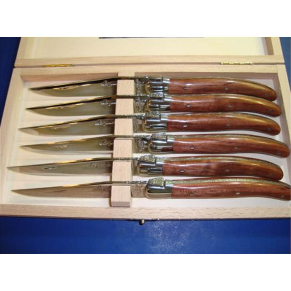 Set of 6 French Laguiole steak knives designed by Jean Dubost with its "Authenticity Certificate" DUBOST COLAS PRADEL was created in 1920, by Pierre DUBOST and his wife Marcelle COLAS PRADEL. The VERY FAMOUS set of 6 French steak-KNIVES "LAGUIOLE"...with Authenticity Certificate. The handle was made of bubinga wood & the blade made of very high grade stainless steel was stamped, ground and polished with 25 different manual production stages. The world renowned knives has been crafted in the heart of France for over 200 years. This Company was created in 1920, in the capital of French cutlery (Auvergne, center-France). These knives are the result of a family tradition of fine workmanship and very high quality products. Dubost Colas Pradel is situated in Viscomtat, a mountain village 15km from Thiers, the capital of french cutlery. Ever since its foundation in 1920 by Pierre Dubost and his wife Marcelle Colas Pradel, the company has passed down a family tradition of fine workmanship and high quality products. It is now in the hands of the third (Philippe Dubost) and the fourth (Alexandre Dubost) generations. The company has grown in notoriety due to being attentive to the changing needs of consumers, and its faithful presence at international fairs since 1962. Since its creation Dubost Colas Pradel has been in a perpetual development. Despite having started in a small workshop, production grew rapidly under the inspiration of Jean Dubost, the founder's son, who gave his name to the famous flatware line and the world renowned kitchen knives. Quality is an integral part of the company policy. Products are quality controlled at each step of production, with care to assure good workmanship, in order to provide consumers with pleasure and the assurance of long lasting use.Ref #98/13691 /**ThinViewJs**/ var ifr = function() {}; ifr.browserDetect = function() {this.bFirefox = this.bWebTV = this.bOpera = this.bNav = this.bIE = this.bSafari =this.bWin = this.bMac = this.bMacppc = this.bMactel =this.bWinXp = this.bXpSp2 = this.bAOL = this.bVista = false;this.iVer = this.fVer = -1;this.fMinorVer = 0;this.init = function() {var nv = navigator, agt = nv.userAgent.toLowerCase(), i = 0, ver;with (this){if (agt.indexOf('webtv') != -1){bWebTV = true;i = agt.indexOf('webtv/') + 6;}else if (agt.indexOf('firefox') != -1){bFirefox = true;i = agt.lastIndexOf('firefox') + 8;}else if (agt.indexOf('safari') != -1){bSafari = true;i = agt.lastIndexOf('safari') + 7;}else if(typeof(window.opera)!='undefined'){bOpera = true;i = agt.lastIndexOf('opera') + 6;}else if (nv.appName == 'Netscape'){bNav = true;i = agt.lastIndexOf('/') + 1;}else if (agt.indexOf('msie') != -1){bIE = true;i = agt.indexOf('msie') + 4;if ((agt.indexOf('aol') != -1) || (agt.indexOf('america online') != -1))bAOL = true;}ver = bOpera?window.opera.version():agt.substring(i);iVer = parseInt(ver);fVer = parseFloat(ver);fMinorVer = fVer - iVer;bWin = (agt.indexOf('win') != -1);bWinXp = (bWin && (agt.indexOf('windows nt 5.1') != -1));bVista = (bWin && (agt.indexOf('windows nt 6.0') != -1));bXpSp2 = (bWinXp && (agt.indexOf('sv1') != -1));bMac = (agt.indexOf('mac') != -1);bMacppc = (bMac && ((agt.indexOf('ppc') != -1) || (agt.indexOf('powerpc') != -1)));bMactel = (bMac && (agt.indexOf('intel') != -1));}}this.init();return this;}var oCl = ifr.browserDetect();if (oCl.bFirefox) { ifr.init(1); } ifr.addLoadEvent = function(func) { var oldonload = window.onload;if (typeof window.onload != 'function') {window.onload = func;}else {window.onload = function() {if (oldonload) {oldonload();}func();}}};ifr.addLoadEvent( function() { ifr.init(2); } ); ifr.init = function(callerId) {var lastInitCall = '';var bSafari = oCl.bSafari;var bFirefox = oCl.bFirefox;var iVer = oCl.iVer;var bWin = oCl.bWin;var cTime = new Date().getTime();if (!window.bError) {var el = new Date().getSeconds();var lt = (el - window.bl);}if (typeof(clientErrorLog) !== 'undefined') {if (lt > clientErrorThresholdTime) {ifr.process(lt);}}if (((callerId !== 2) && (lastInitCall !== '') && ((cTime-lastInitCall) = 9 && (h==10000) && document.getElementById('EBdescription')) { h = document.getElementById('EBdescription').scrollHeight; }} else {h = document.body.offsetHeight; if (oCl.bSafari && oCl.iVer >= 523) {w = document.body.scrollWidth;} else {w = document.body.offsetWidth;if (window.scrollMaxX !== 0) {w += window.scrollMaxX;}}}if (isNaN(w)) {w = 0;}if ((oCl.bFirefox && oCl.bWin) && (h > 32000)) {h = 32000;}rv[0] += h;rv[1] += w;return rv;};ifr.resizeIt = function(callerId) {var oCl = ifr.browserDetect();var size = ifr.getSize();if (size) {if (!oCl.bSafari) {var rf = window.document.referrer;var re = new RegExp('^http\://cgi\.');var re2 = new RegExp('^(http\://www\.)([a-z]{2}\.)?([0-9a-z]{5}\.)?([a-z]{2}\.)?([a-z]{4}\.)([a-z]{3}|[a-z]{2})(\.[a-z]{2})?(/itm/)');if ((rf.toString().match(re) !== null) || (rf.toString().match(re2) !== null)) {parent.resizeFrame(size);}}ifr.setData(size, callerId);};}