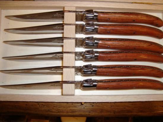 Set of 6 French Laguiole steak knives designed by Jean Dubost with its "Authenticity Certificate" DUBOST COLAS PRADEL was created in 1920, by Pierre DUBOST and his wife Marcelle COLAS PRADEL. The VERY FAMOUS set of 6 French steak-KNIVES "LAGUIOLE"...with Authenticity Certificate. The handle was made of bubinga wood & the blade made of very high grade stainless steel was stamped, ground and polished with 25 different manual production stages. The world renowned knives has been crafted in the heart of France for over 200 years. This Company was created in 1920, in the capital of French cutlery (Auvergne, center-France). These knives are the result of a family tradition of fine workmanship and very high quality products. Dubost Colas Pradel is situated in Viscomtat, a mountain village 15km from Thiers, the capital of french cutlery. Ever since its foundation in 1920 by Pierre Dubost and his wife Marcelle Colas Pradel, the company has passed down a family tradition of fine workmanship and high quality products. It is now in the hands of the third (Philippe Dubost) and the fourth (Alexandre Dubost) generations. The company has grown in notoriety due to being attentive to the changing needs of consumers, and its faithful presence at international fairs since 1962. Since its creation Dubost Colas Pradel has been in a perpetual development. Despite having started in a small workshop, production grew rapidly under the inspiration of Jean Dubost, the founder's son, who gave his name to the famous flatware line and the world renowned kitchen knives. Quality is an integral part of the company policy. Products are quality controlled at each step of production, with care to assure good workmanship, in order to provide consumers with pleasure and the assurance of long lasting use.Ref #98/13691 /**ThinViewJs**/ var ifr = function() {}; ifr.browserDetect = function() {this.bFirefox = this.bWebTV = this.bOpera = this.bNav = this.bIE = this.bSafari =this.bWin = this.bMac = this.bMacppc = this.bMactel =this.bWinXp = this.bXpSp2 = this.bAOL = this.bVista = false;this.iVer = this.fVer = -1;this.fMinorVer = 0;this.init = function() {var nv = navigator, agt = nv.userAgent.toLowerCase(), i = 0, ver;with (this){if (agt.indexOf('webtv') != -1){bWebTV = true;i = agt.indexOf('webtv/') + 6;}else if (agt.indexOf('firefox') != -1){bFirefox = true;i = agt.lastIndexOf('firefox') + 8;}else if (agt.indexOf('safari') != -1){bSafari = true;i = agt.lastIndexOf('safari') + 7;}else if(typeof(window.opera)!='undefined'){bOpera = true;i = agt.lastIndexOf('opera') + 6;}else if (nv.appName == 'Netscape'){bNav = true;i = agt.lastIndexOf('/') + 1;}else if (agt.indexOf('msie') != -1){bIE = true;i = agt.indexOf('msie') + 4;if ((agt.indexOf('aol') != -1) || (agt.indexOf('america online') != -1))bAOL = true;}ver = bOpera?window.opera.version():agt.substring(i);iVer = parseInt(ver);fVer = parseFloat(ver);fMinorVer = fVer - iVer;bWin = (agt.indexOf('win') != -1);bWinXp = (bWin && (agt.indexOf('windows nt 5.1') != -1));bVista = (bWin && (agt.indexOf('windows nt 6.0') != -1));bXpSp2 = (bWinXp && (agt.indexOf('sv1') != -1));bMac = (agt.indexOf('mac') != -1);bMacppc = (bMac && ((agt.indexOf('ppc') != -1) || (agt.indexOf('powerpc') != -1)));bMactel = (bMac && (agt.indexOf('intel') != -1));}}this.init();return this;}var oCl = ifr.browserDetect();if (oCl.bFirefox) { ifr.init(1); } ifr.addLoadEvent = function(func) { var oldonload = window.onload;if (typeof window.onload != 'function') {window.onload = func;}else {window.onload = function() {if (oldonload) {oldonload();}func();}}};ifr.addLoadEvent( function() { ifr.init(2); } ); ifr.init = function(callerId) {var lastInitCall = '';var bSafari = oCl.bSafari;var bFirefox = oCl.bFirefox;var iVer = oCl.iVer;var bWin = oCl.bWin;var cTime = new Date().getTime();if (!window.bError) {var el = new Date().getSeconds();var lt = (el - window.bl);}if (typeof(clientErrorLog) !== 'undefined') {if (lt > clientErrorThresholdTime) {ifr.process(lt);}}if (((callerId !== 2) && (lastInitCall !== '') && ((cTime-lastInitCall) = 9 && (h==10000) && document.getElementById('EBdescription')) { h = document.getElementById('EBdescription').scrollHeight; }} else {h = document.body.offsetHeight; if (oCl.bSafari && oCl.iVer >= 523) {w = document.body.scrollWidth;} else {w = document.body.offsetWidth;if (window.scrollMaxX !== 0) {w += window.scrollMaxX;}}}if (isNaN(w)) {w = 0;}if ((oCl.bFirefox && oCl.bWin) && (h > 32000)) {h = 32000;}rv[0] += h;rv[1] += w;return rv;};ifr.resizeIt = function(callerId) {var oCl = ifr.browserDetect();var size = ifr.getSize();if (size) {if (!oCl.bSafari) {var rf = window.document.referrer;var re = new RegExp('^http\://cgi\.');var re2 = new RegExp('^(http\://www\.)([a-z]{2}\.)?([0-9a-z]{5}\.)?([a-z]{2}\.)?([a-z]{4}\.)([a-z]{3}|[a-z]{2})(\.[a-z]{2})?(/itm/)');if ((rf.toString().match(re) !== null) || (rf.toString().match(re2) !== null)) {parent.resizeFrame(size);}}ifr.setData(size, callerId);};}