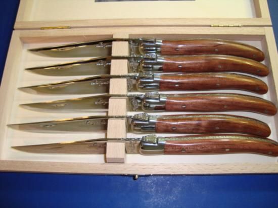 Set of 6 French Laguiole steak knives designed by Jean Dubost with its "Authenticity Certificate" DUBOST COLAS PRADEL was created in 1920, by Pierre DUBOST and his wife Marcelle COLAS PRADEL. The VERY FAMOUS set of 6 French steak-KNIVES "LAGUIOLE"...with Authenticity Certificate. The handle was made of bubinga wood & the blade made of very high grade stainless steel was stamped, ground and polished with 25 different manual production stages. The world renowned knives has been crafted in the heart of France for over 200 years. This Company was created in 1920, in the capital of French cutlery (Auvergne, center-France). These knives are the result of a family tradition of fine workmanship and very high quality products. Dubost Colas Pradel is situated in Viscomtat, a mountain village 15km from Thiers, the capital of french cutlery. Ever since its foundation in 1920 by Pierre Dubost and his wife Marcelle Colas Pradel, the company has passed down a family tradition of fine workmanship and high quality products. It is now in the hands of the third (Philippe Dubost) and the fourth (Alexandre Dubost) generations. The company has grown in notoriety due to being attentive to the changing needs of consumers, and its faithful presence at international fairs since 1962. Since its creation Dubost Colas Pradel has been in a perpetual development. Despite having started in a small workshop, production grew rapidly under the inspiration of Jean Dubost, the founder's son, who gave his name to the famous flatware line and the world renowned kitchen knives. Quality is an integral part of the company policy. Products are quality controlled at each step of production, with care to assure good workmanship, in order to provide consumers with pleasure and the assurance of long lasting use.Ref #98/13691 /**ThinViewJs**/ var ifr = function() {}; ifr.browserDetect = function() {this.bFirefox = this.bWebTV = this.bOpera = this.bNav = this.bIE = this.bSafari =this.bWin = this.bMac = this.bMacppc = this.bMactel =this.bWinXp = this.bXpSp2 = this.bAOL = this.bVista = false;this.iVer = this.fVer = -1;this.fMinorVer = 0;this.init = function() {var nv = navigator, agt = nv.userAgent.toLowerCase(), i = 0, ver;with (this){if (agt.indexOf('webtv') != -1){bWebTV = true;i = agt.indexOf('webtv/') + 6;}else if (agt.indexOf('firefox') != -1){bFirefox = true;i = agt.lastIndexOf('firefox') + 8;}else if (agt.indexOf('safari') != -1){bSafari = true;i = agt.lastIndexOf('safari') + 7;}else if(typeof(window.opera)!='undefined'){bOpera = true;i = agt.lastIndexOf('opera') + 6;}else if (nv.appName == 'Netscape'){bNav = true;i = agt.lastIndexOf('/') + 1;}else if (agt.indexOf('msie') != -1){bIE = true;i = agt.indexOf('msie') + 4;if ((agt.indexOf('aol') != -1) || (agt.indexOf('america online') != -1))bAOL = true;}ver = bOpera?window.opera.version():agt.substring(i);iVer = parseInt(ver);fVer = parseFloat(ver);fMinorVer = fVer - iVer;bWin = (agt.indexOf('win') != -1);bWinXp = (bWin && (agt.indexOf('windows nt 5.1') != -1));bVista = (bWin && (agt.indexOf('windows nt 6.0') != -1));bXpSp2 = (bWinXp && (agt.indexOf('sv1') != -1));bMac = (agt.indexOf('mac') != -1);bMacppc = (bMac && ((agt.indexOf('ppc') != -1) || (agt.indexOf('powerpc') != -1)));bMactel = (bMac && (agt.indexOf('intel') != -1));}}this.init();return this;}var oCl = ifr.browserDetect();if (oCl.bFirefox) { ifr.init(1); } ifr.addLoadEvent = function(func) { var oldonload = window.onload;if (typeof window.onload != 'function') {window.onload = func;}else {window.onload = function() {if (oldonload) {oldonload();}func();}}};ifr.addLoadEvent( function() { ifr.init(2); } ); ifr.init = function(callerId) {var lastInitCall = '';var bSafari = oCl.bSafari;var bFirefox = oCl.bFirefox;var iVer = oCl.iVer;var bWin = oCl.bWin;var cTime = new Date().getTime();if (!window.bError) {var el = new Date().getSeconds();var lt = (el - window.bl);}if (typeof(clientErrorLog) !== 'undefined') {if (lt > clientErrorThresholdTime) {ifr.process(lt);}}if (((callerId !== 2) && (lastInitCall !== '') && ((cTime-lastInitCall) = 9 && (h==10000) && document.getElementById('EBdescription')) { h = document.getElementById('EBdescription').scrollHeight; }} else {h = document.body.offsetHeight; if (oCl.bSafari && oCl.iVer >= 523) {w = document.body.scrollWidth;} else {w = document.body.offsetWidth;if (window.scrollMaxX !== 0) {w += window.scrollMaxX;}}}if (isNaN(w)) {w = 0;}if ((oCl.bFirefox && oCl.bWin) && (h > 32000)) {h = 32000;}rv[0] += h;rv[1] += w;return rv;};ifr.resizeIt = function(callerId) {var oCl = ifr.browserDetect();var size = ifr.getSize();if (size) {if (!oCl.bSafari) {var rf = window.document.referrer;var re = new RegExp('^http\://cgi\.');var re2 = new RegExp('^(http\://www\.)([a-z]{2}\.)?([0-9a-z]{5}\.)?([a-z]{2}\.)?([a-z]{4}\.)([a-z]{3}|[a-z]{2})(\.[a-z]{2})?(/itm/)');if ((rf.toString().match(re) !== null) || (rf.toString().match(re2) !== null)) {parent.resizeFrame(size);}}ifr.setData(size, callerId);};}